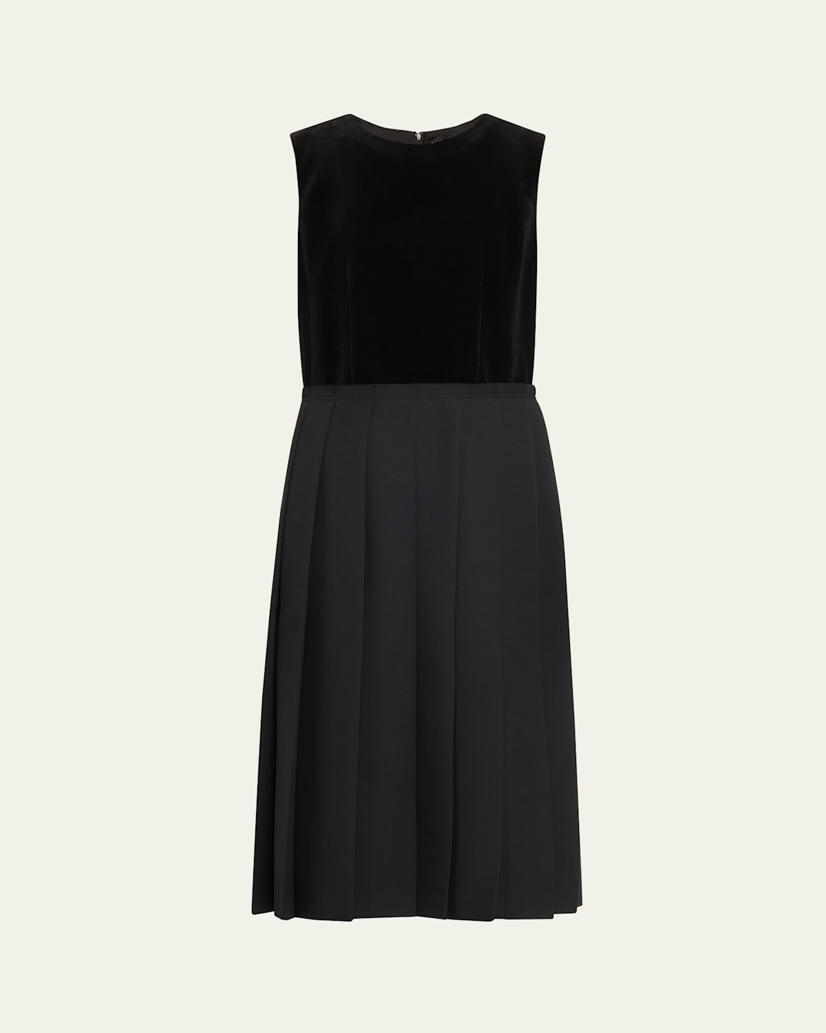 Comme des Garcons dress with a velvet bodice and a pleated gaberdine skirt Round neckline Sleeveless Hem falls below the knee Aline silhouette Invisible back zip Polyester Made in Japan