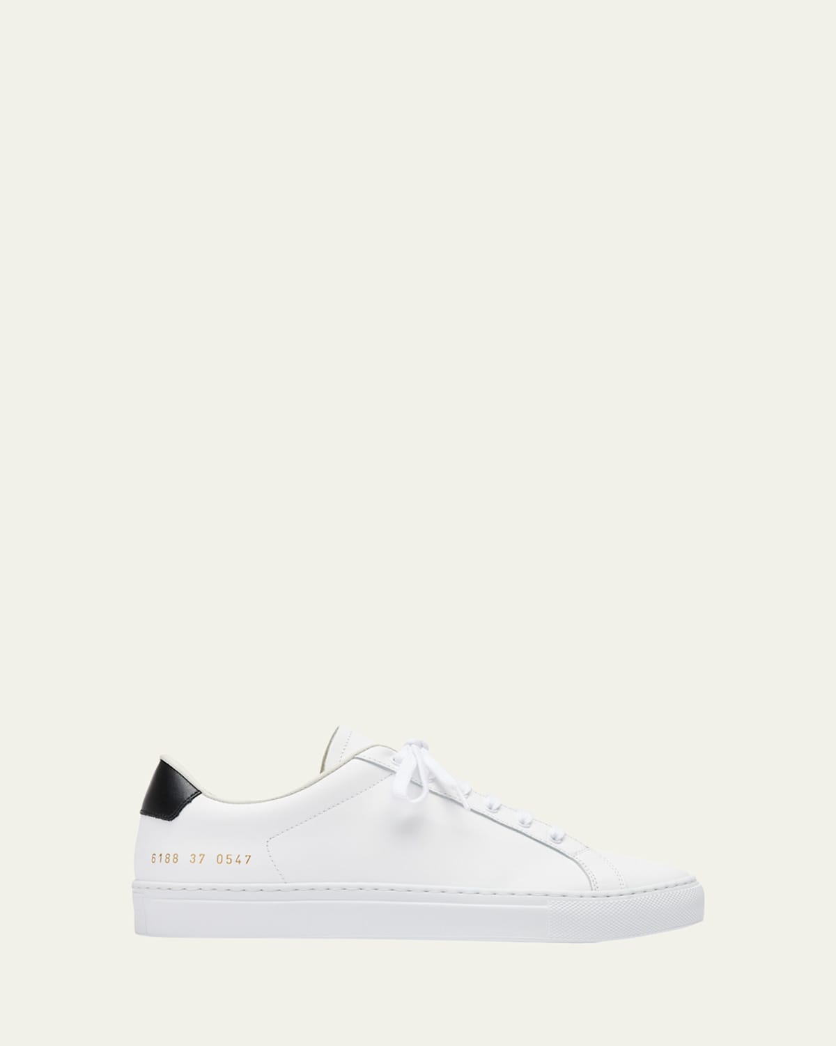Common Projects "Retro" sneakers in smooth leather. Flat heel. Round toe. Laceup vamp. Serial number print at sides. Contrast heel. Rubber sole. Made in Italy.