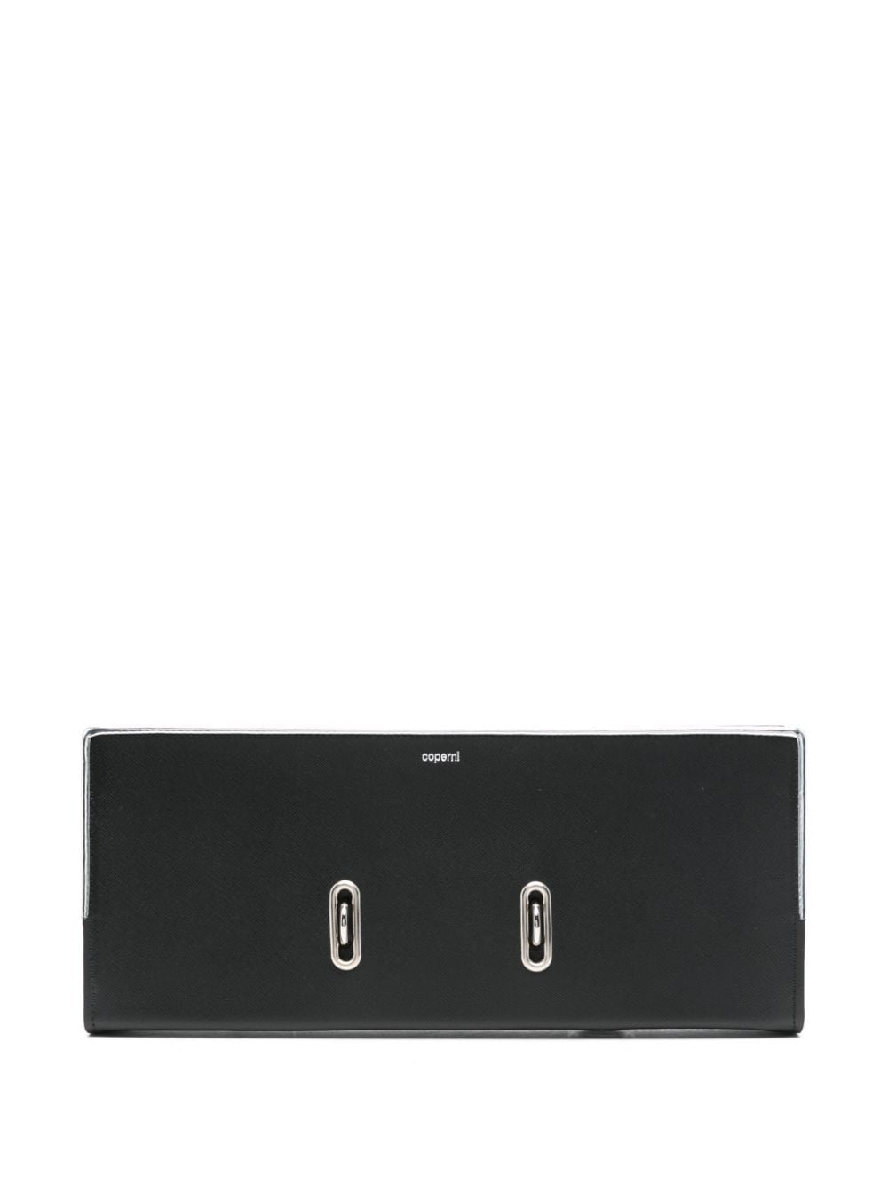 black calf leather textured finish metallic trim binder rings metal eyelet detailing main compartment internal logo stamp contrast lining silver-tone hardware concealed magnetic fastening