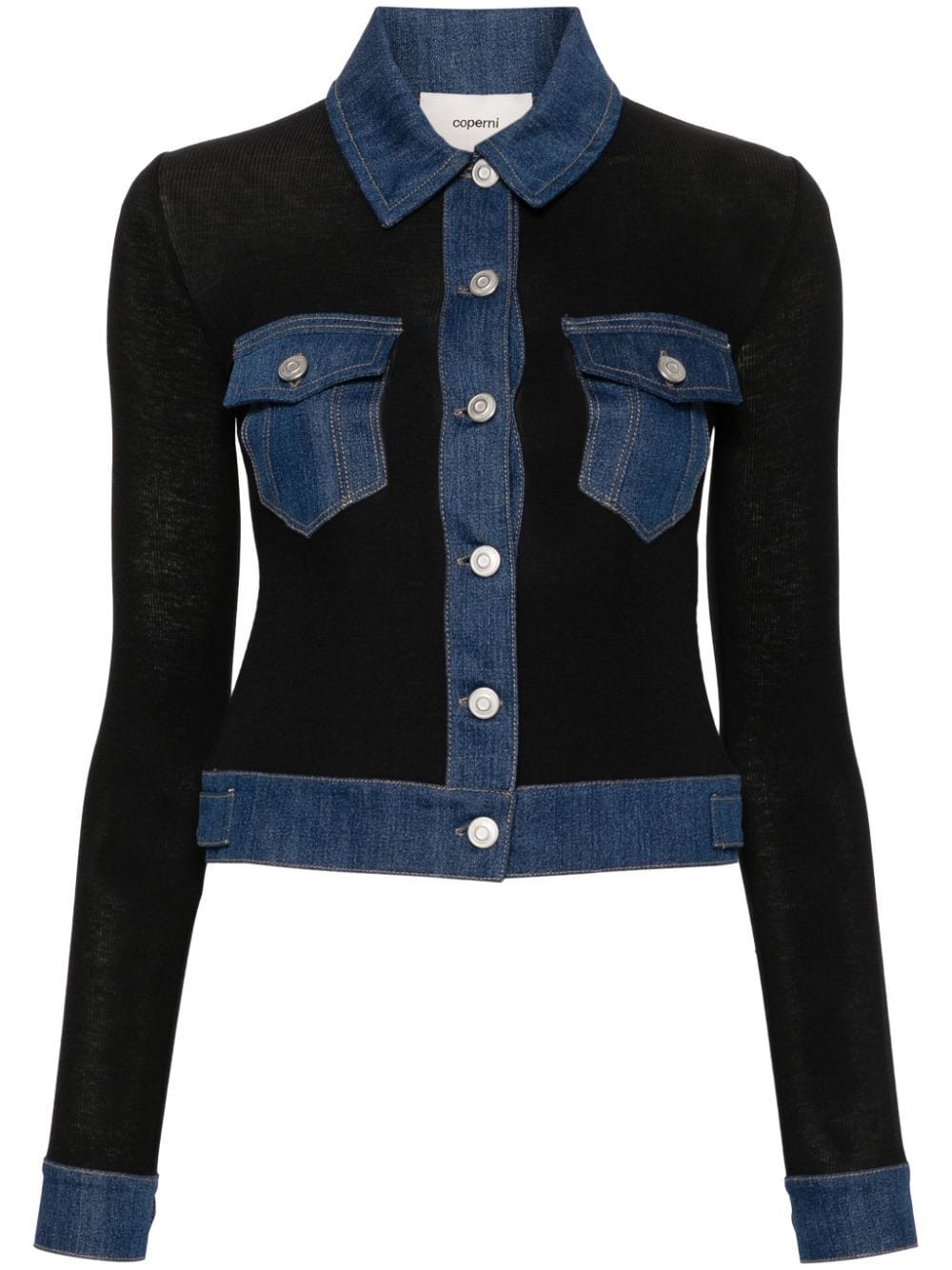 black/blue lyocell-cotton blend denim trim fine ribbed classic collar front button fastening long sleeves with buttoned cuffs two button-fastening chest pockets straight hem This item contains at least 50% materials which are certified or widely recognised as having a lower environmental impact through production and/or manufacturing processes that reduce water consumption and the use of harmful chemicals, or re-use by-products of the production process. Learn more about what makes a product Conscious on our Conscious Criteria page