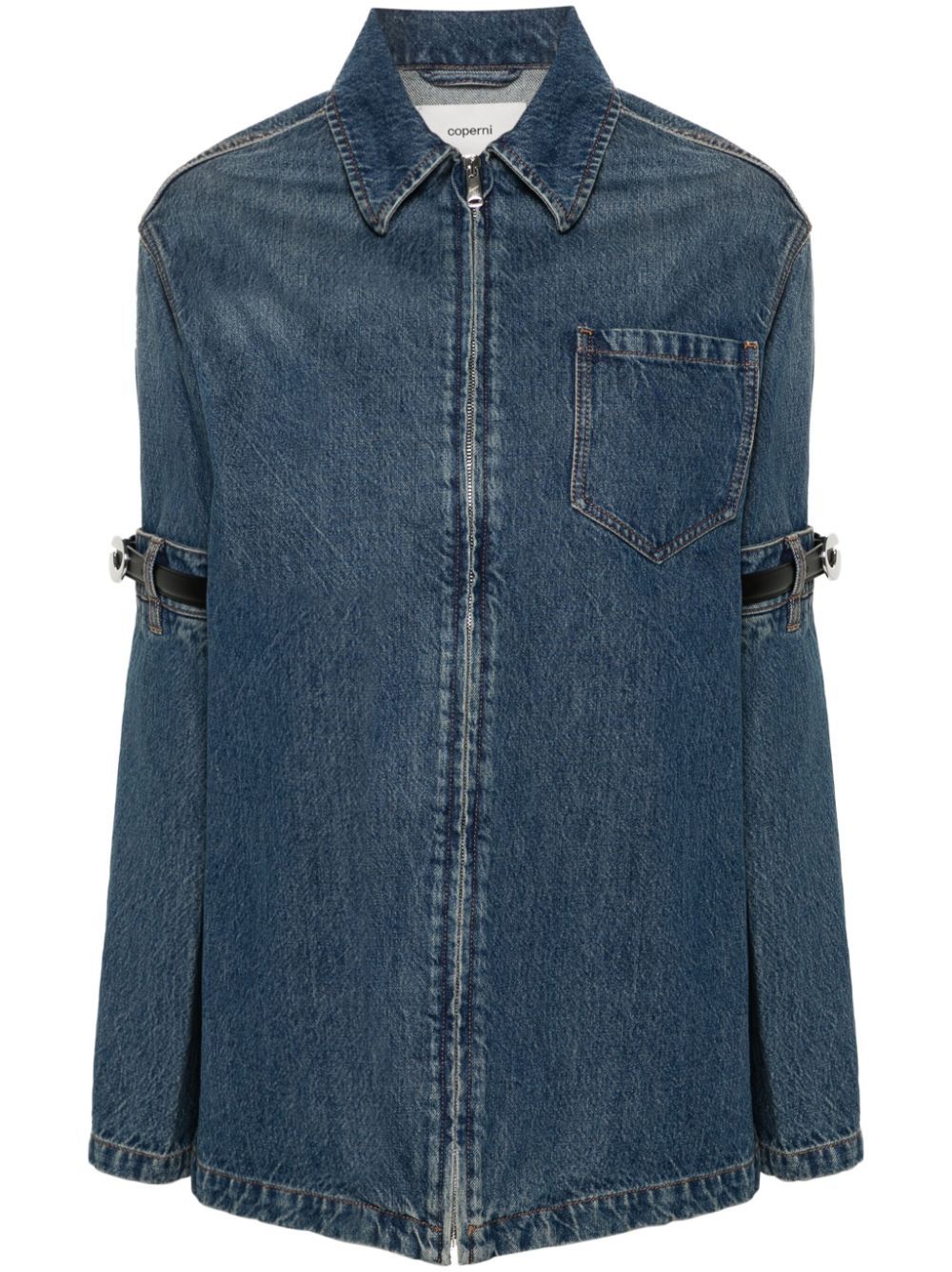 indigo blue cotton washed denim silver-tone logo plaque classic collar front zip fastening long sleeves belted elbows chest patch pocket straight hem