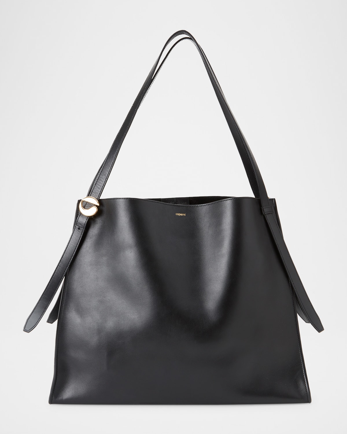 Coperni spacious tote bag in smooth leather, embellished with a Clogo buckle on a minimalist design Flat shoulder straps Open top Lining: Polyurethane Approx. 13.7"H x 16"W x 5.9"D Made in Italy