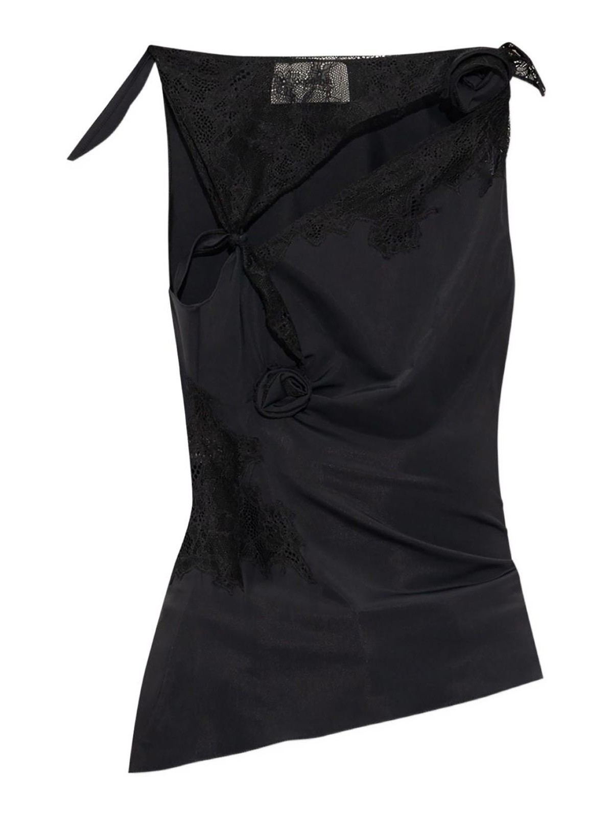 Top en dentelle, une pièce féminine et sophistiquée de Coperni, ce haut noir se distingue par son élégante dentelle et sa rose florale, enrichie d'un drapé raffiné qui met en valeur la silhouette avec une sensualité discrète. Top Coperni en dentelle noire drapé de rose