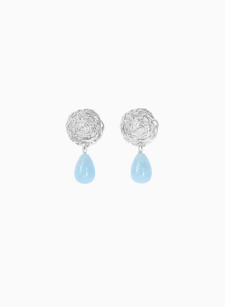 A pair of handmade earrings in recycled sterling silver shaped like rose buds with aquamarine stones
