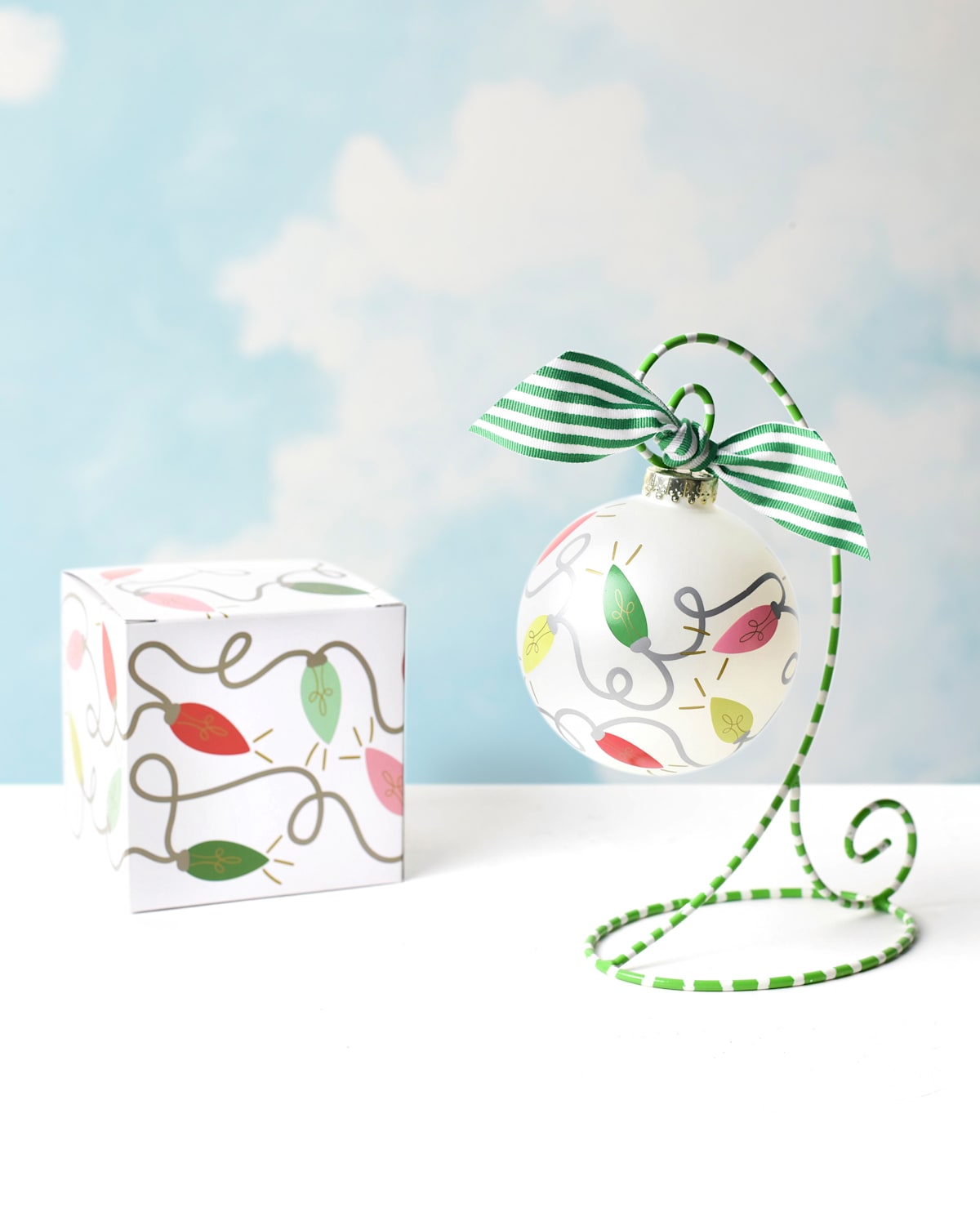 Handpainted Christmas ornament made of glass and metal alloy Includes a coordinating grosgrain ribbon, matching gift box, and a green and white stand Personalize with name (up to 24 characters/spaces) and year (up to four characters/spaces) in color and typestyle shown Ornament, 4"Dia. Ornament stand, 5.5"W x 0.3"D x 9"T Item Weight (Lbs.): 0.5 Fragile- handle with care. Store in original box. Imported