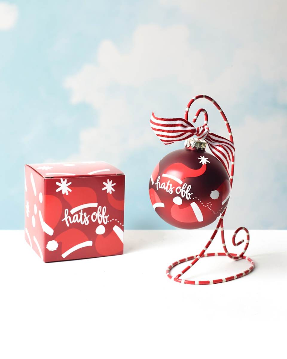 Handpainted Christmas ornament made of glass and metal alloy Includes a coordinating grosgrain ribbon, matching gift box, and a red and white stand Personalize with name (up to 24 characters/spaces) and year (up to four characters/spaces) in color and typestyle shown Preprinted Sentiment: hats off Ornament, 4"Dia. Ornament stand, 5.5"W x 0.3"D x 9"T Item Weight (Lbs.): 0.5 Fragile- handle with care. Store in original box. Imported