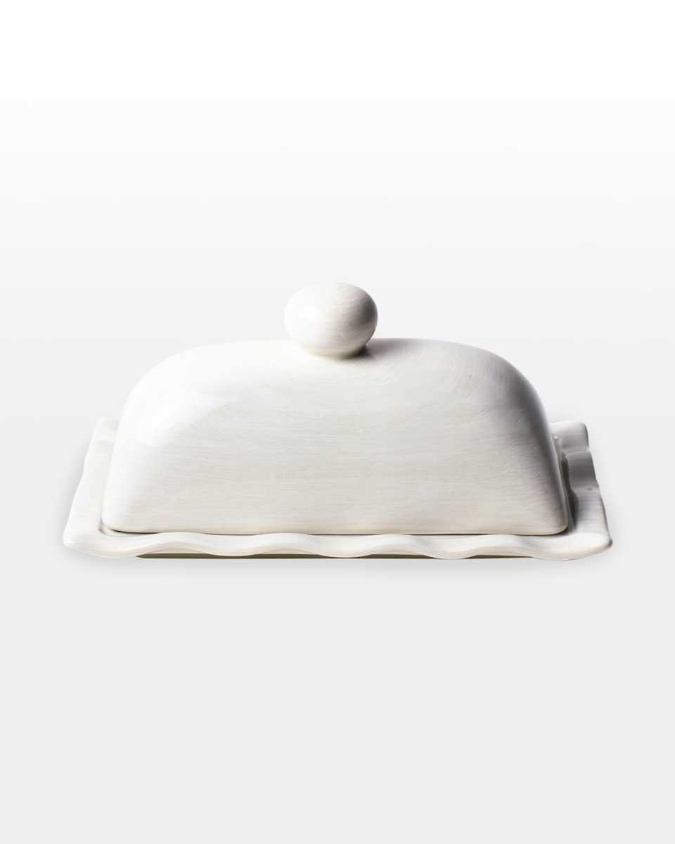 Featuring signature ruffled edges, this piece will inspire you to celebrate every day Lidded butter dish is handcrafted of stoneware Approx. 4"L x 7.75"W x 4"T Hand wash Imported