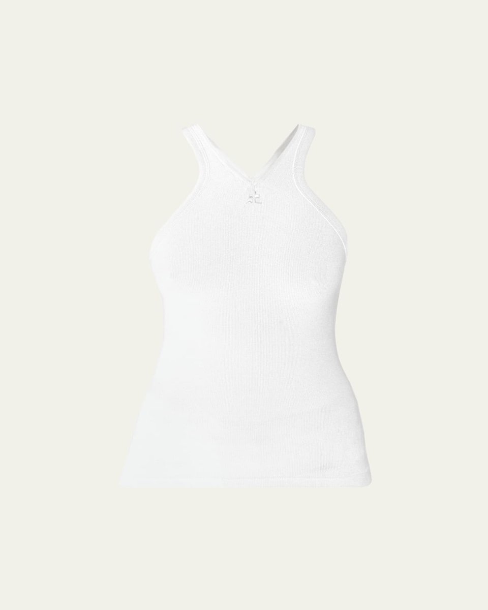 Courreges crisscross ribbed knit tank top features logo embroidery at the front Vneckline Sleeveless Hip length Fitted Pullover style Cotton/elastane Made in Portugal