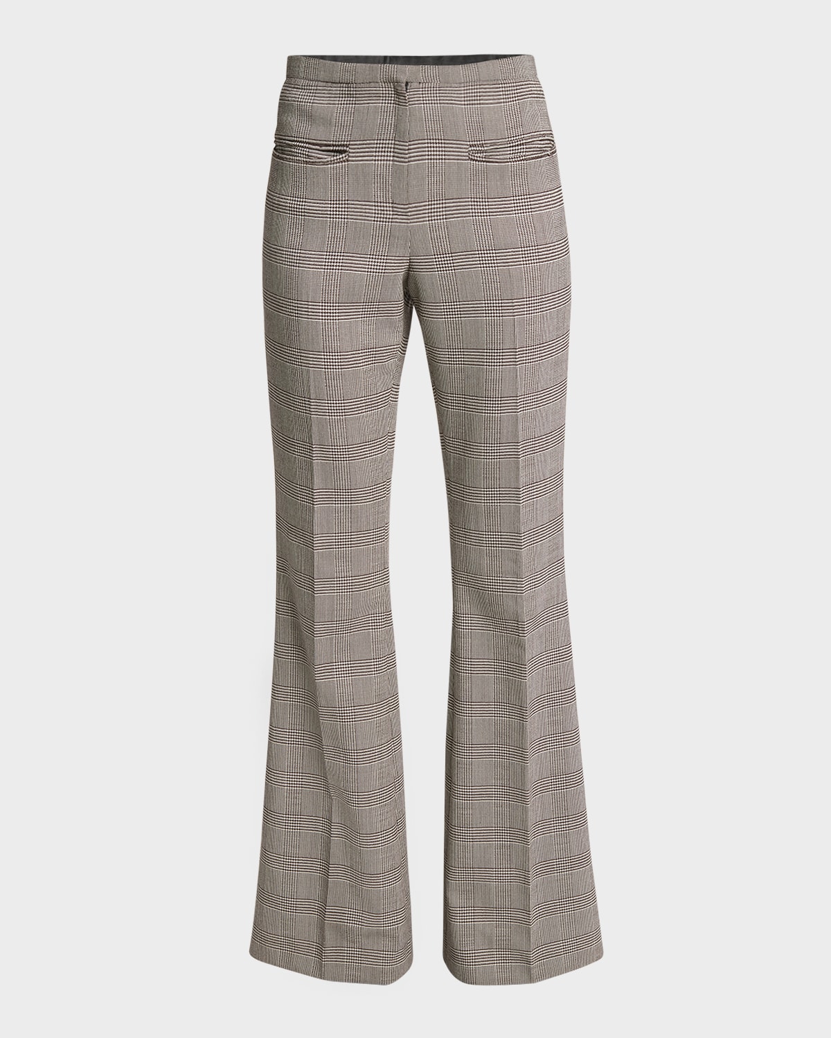 Courreges heritage double crepe pants featuring a check motif Mid rise sits high on hip Flat front Front and back welt pocket Bootcut legs Full length Hook/zip fly Wool/polyester Made in Romania