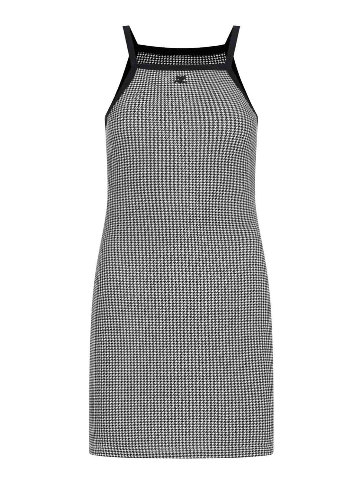 Mini-robe pied-de-poule gris-noir sans manches à fines bretelles, logo brodé sur le devant, ourlet droit