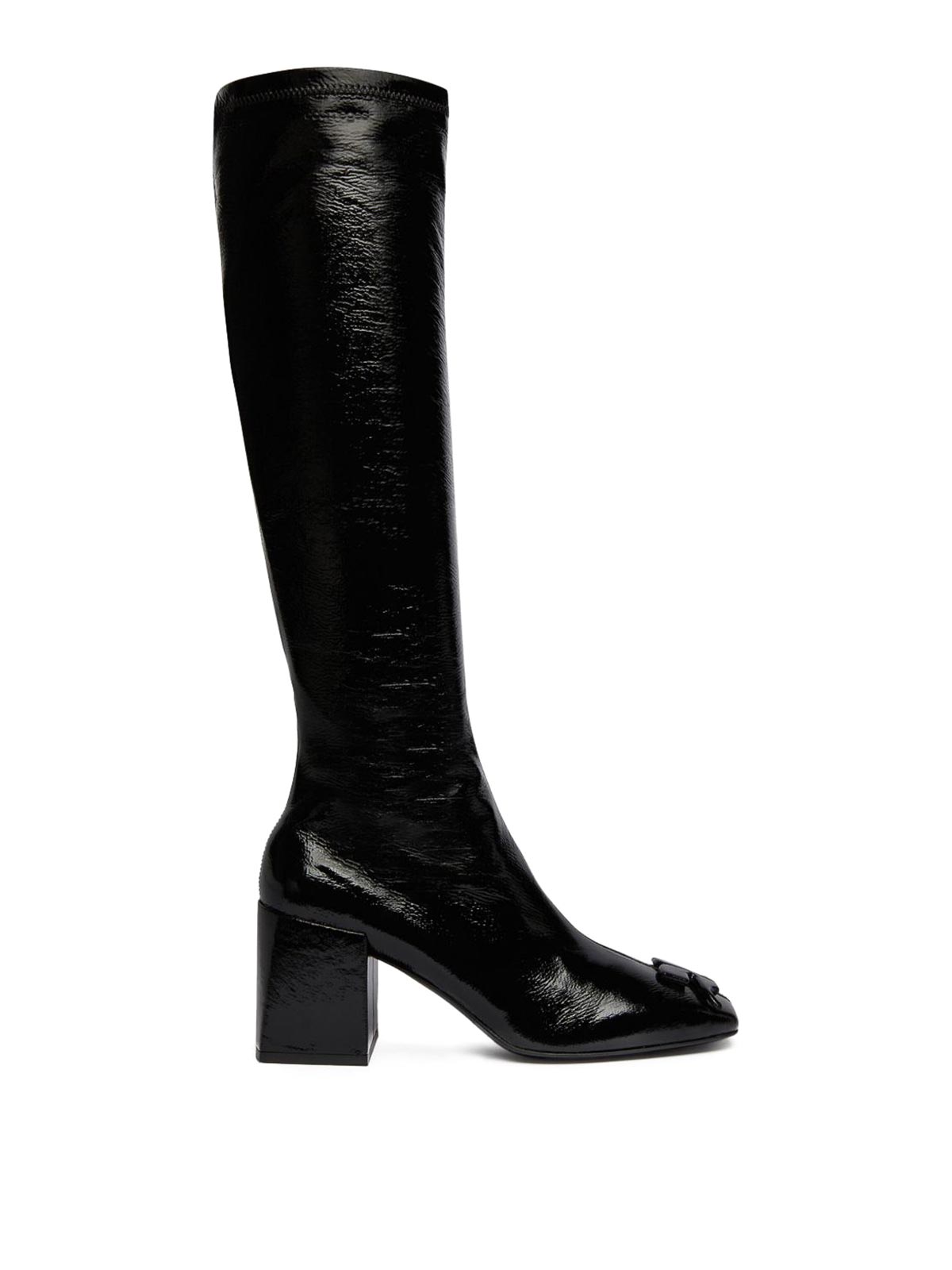 Black glossy finish with tone on tone logo design pull on the side knee height with short zip square tip and wide origin Italy
