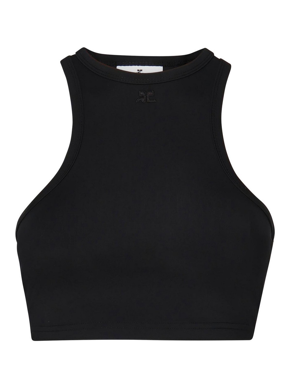 Soutien-gorge à dos croisé en jersey, logo brodé sous l'encolure et logo Courges sur la languette arrière. La taille indiquée sur la photo est de couleur noire