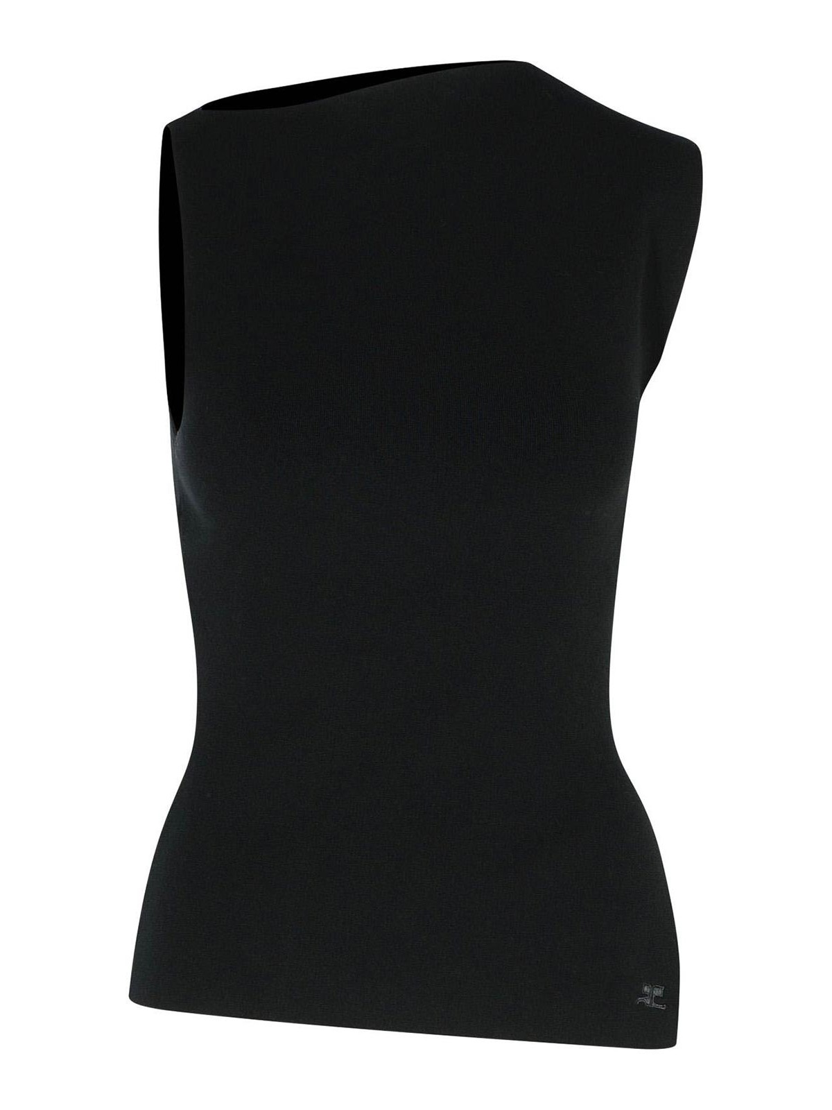 Structure asymétrique, encolure droite, logo brodé ton sur ton sur l'ourlet, ourlet avec fente latérale