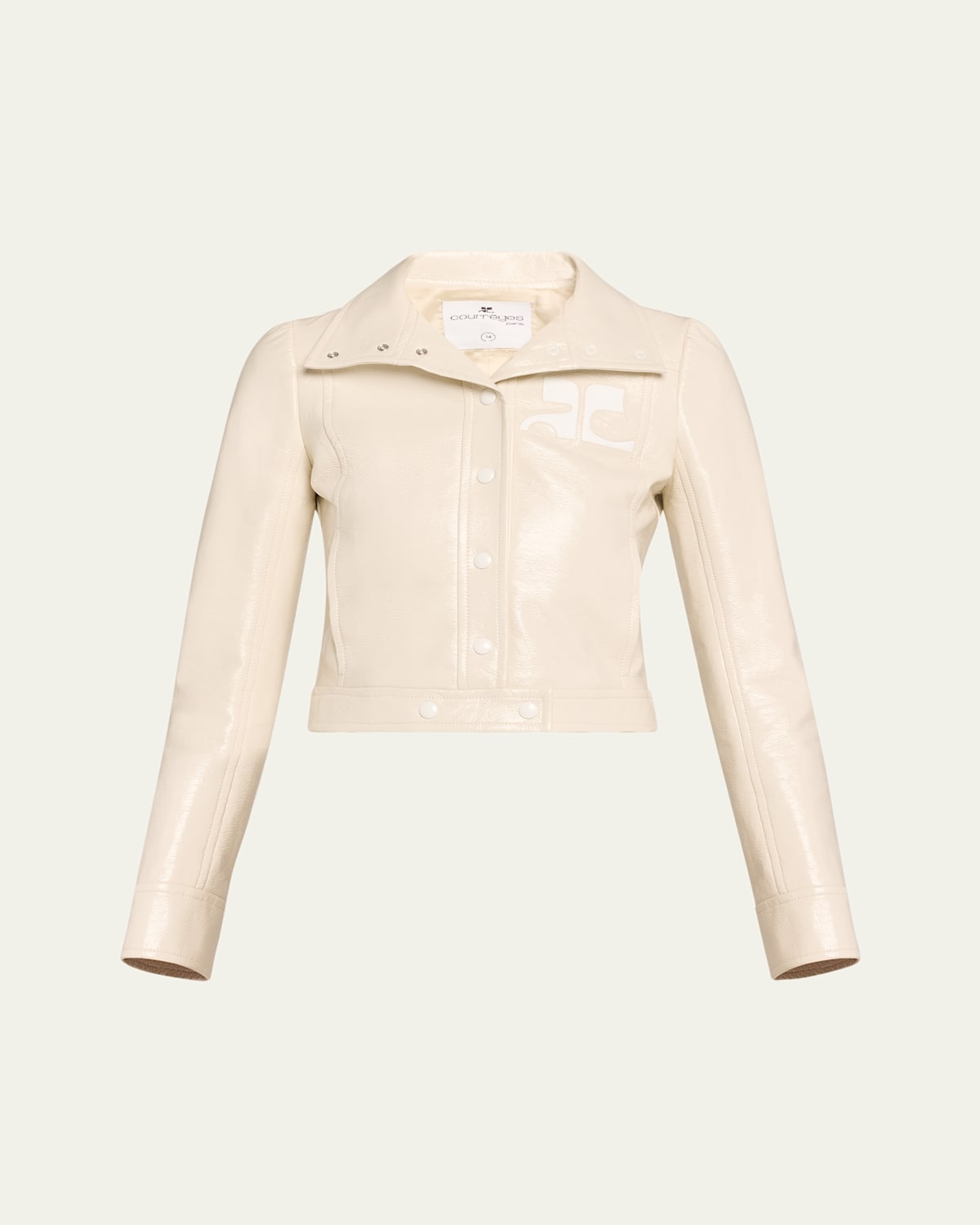 Courreges vinyl reedition jacket featuring logo front Spread collar; snap front Long sleeves; snap cuffs Side slip pockets Slim fit Cotton/polyurethane/elastane Lining: Cupro Imported