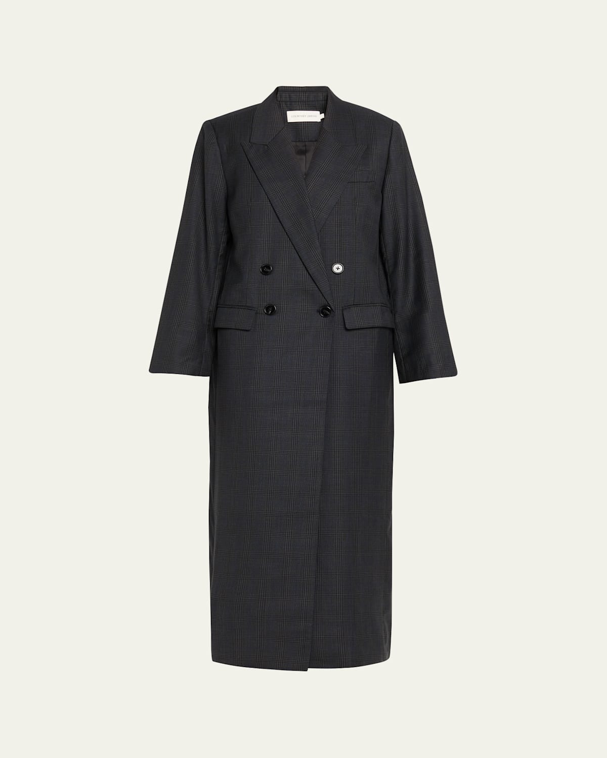 Tailored in a check printed wool, the "Danique" coat by Courtney Zheng features menswearinspired details with an elongated silhouette for a refined lok. Wide peak lapels Doublebreasted front Long sleeves with button cuffs; approx. 25"L Chest welt pocket Hip flap pockets Boxy fit Walking vent Buttonfront Wool/polyester Dry clean Imported