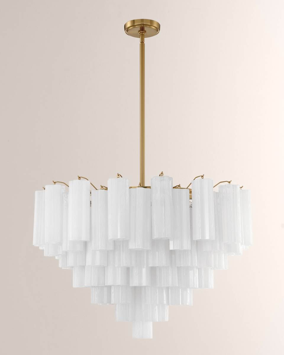 Crafted of steel and glass Uses sixteen 60watt E12 candelabra bulbs Canopy, 5.5"Dia x 1"T Approx. 32"Dia x 64.8"T UL listed Includes hanging hardware; (1) 6" + (3) 12" rods Professional installation is recommended Spot clean Imported Weight, 90.0 lbs Boxed weight, approximately 100.0 lbs