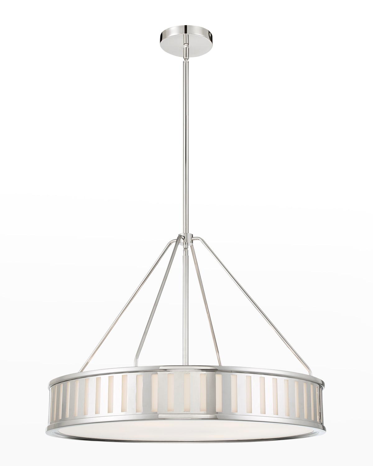 Pendant light made of steel Uses six 60watt bulbs Backplate dimensions: 5.875"W x 1"T Approx. 0"L x 28.0"W Hanging hardware is included Assembly required For indoor use UL listed Wipe clean Imported Weight, 25.1lbs Boxed weight, approximately 32.1lbs