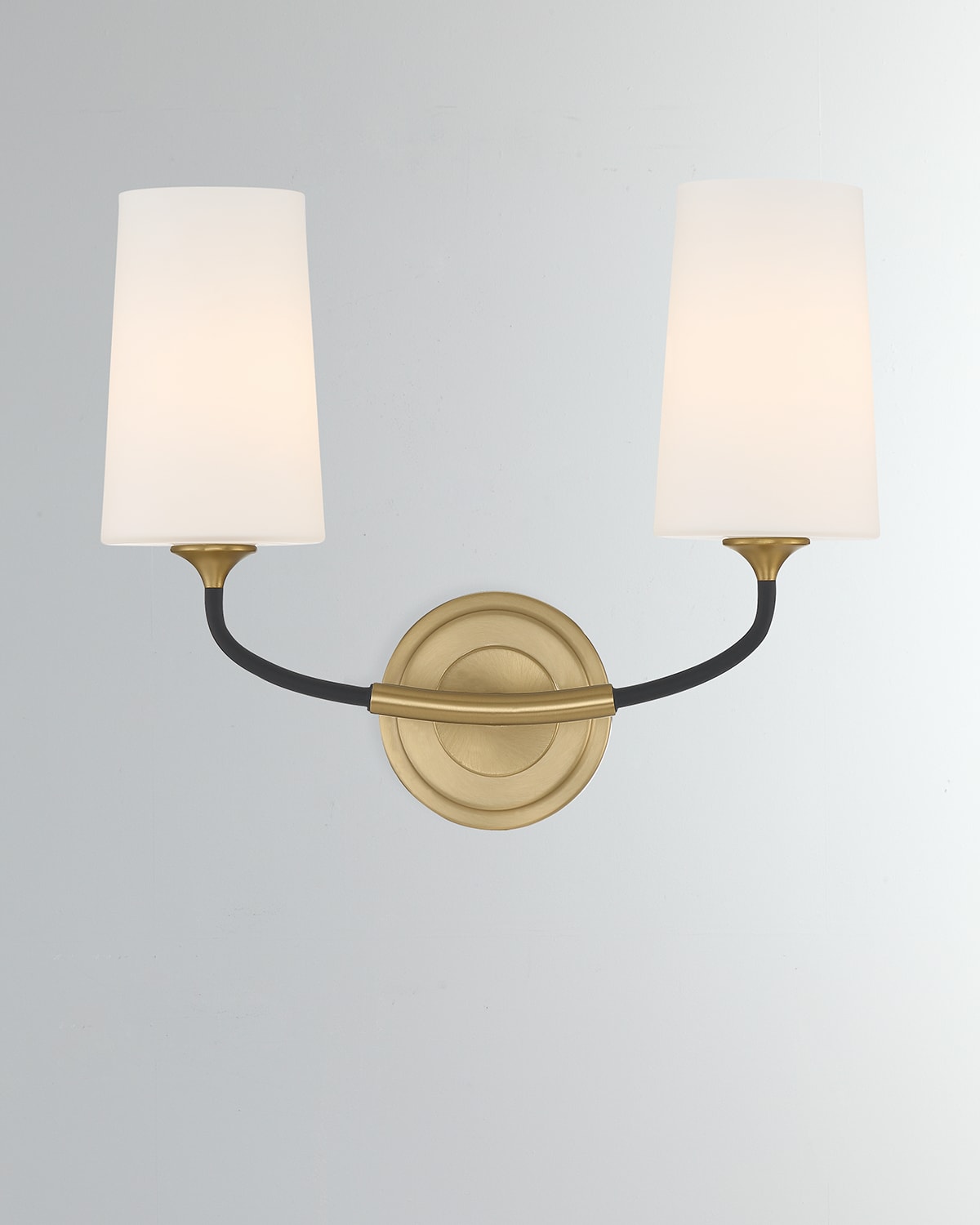 Industrial wall light crafted of steel with tempered glass shades Uses two E12 60watt bulbs Approx. 15"W x 12"T x 5.75"D Lampshade dimensions: 4.33"W x 6.7"T Backplate: 4.72"W x 1"D Hanging hardware included For indoor use Spot clean Imported Weight, 3.5lbs Boxed weight, approximately 5.0lbs
