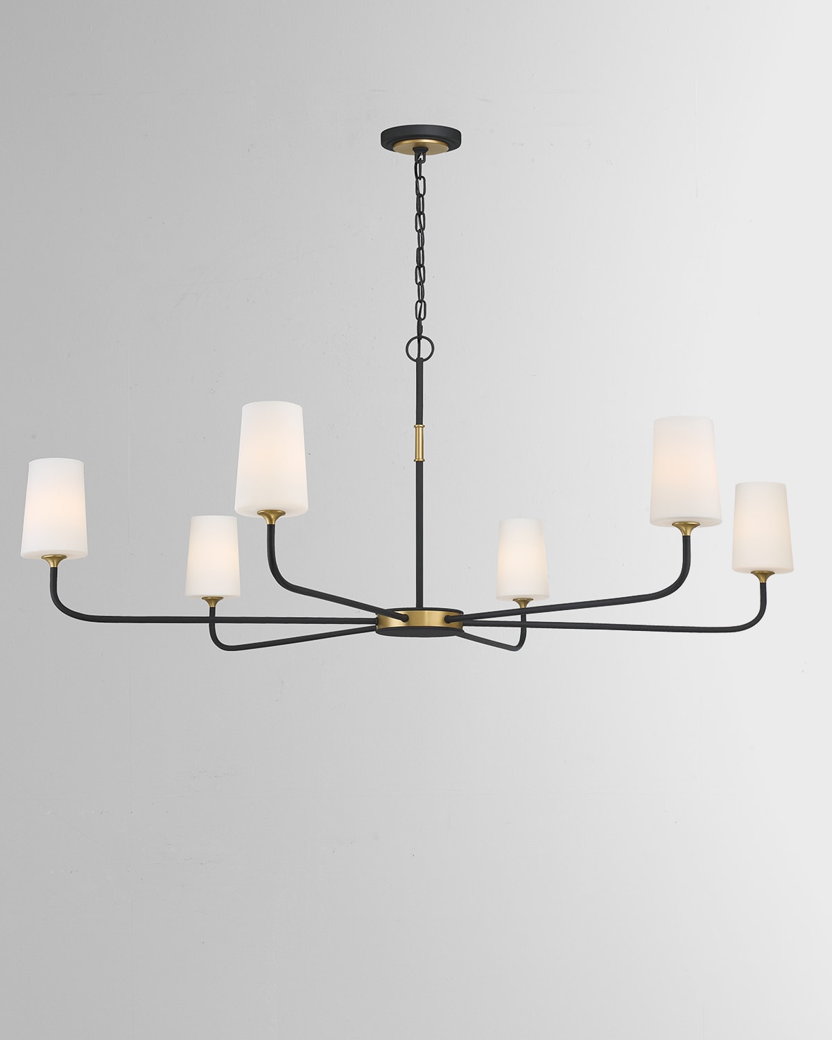 Combining contemporary and industrial styles, the Niles chandelier is a striking addition to any style home. Its elegant elongated arms gracefully lift upwards to hold tapered white glass shades. Its black forged steel metal frame is highlighted with the perfect balance of gold accents. The versatile Nile Collection provides warm and welcoming light to various decor styles and spaces. Uses six 60watt bulbs Approx. 4.3"Dia x 6.7"T Professional installation is recommended Hanging hardware included Spot clean Imported Weight, 14.5lbs Boxed weight, approximately 37.4lbs