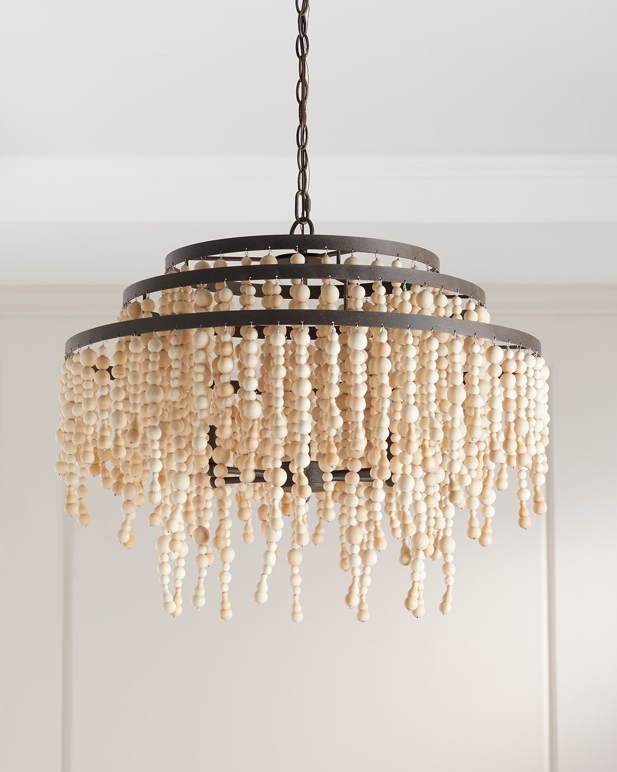 In a perfect combination of texture and materials, the Poppy chandelier's natural, organic wooden beads create a rich visual impact to any space. Whether the look is rustic, boho, or a coastal vibe, this light is as versatile as it is stylish. A design that uses an emphasis on natural, organic, and raw materials to create an earthy and casual atmosphere. Steel frame. Overall: 26.5"W x 21.25"T. Uses six E12 candelabra bulbs. Hanging hardware is included. Imported. Boxed weight, approximately 27.5 lbs.