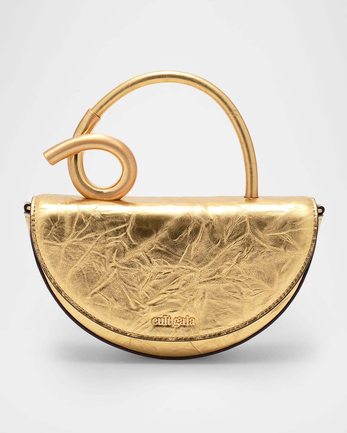 Designed in a clean halfmoon shape, this Cult Gaia "Azariah" crossbody bag is crafted in crinkled metallic leather with a sculptural handle in brushed brass Brass top handle Detachable crossbody strap Can be worn as a tophandle or crossbody bag Flap top with magnetic closure Lining: Recycled polyester/polyester Approx. 4.5"H x 7.8"W x 1.7"D Spot clean Imported