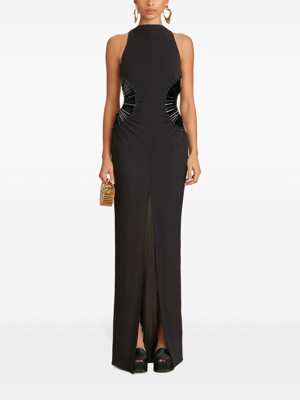 black twill weave bead embellishment cut-out detailing front slit crew neck concealed rear zip fastening sleeveless straight hem