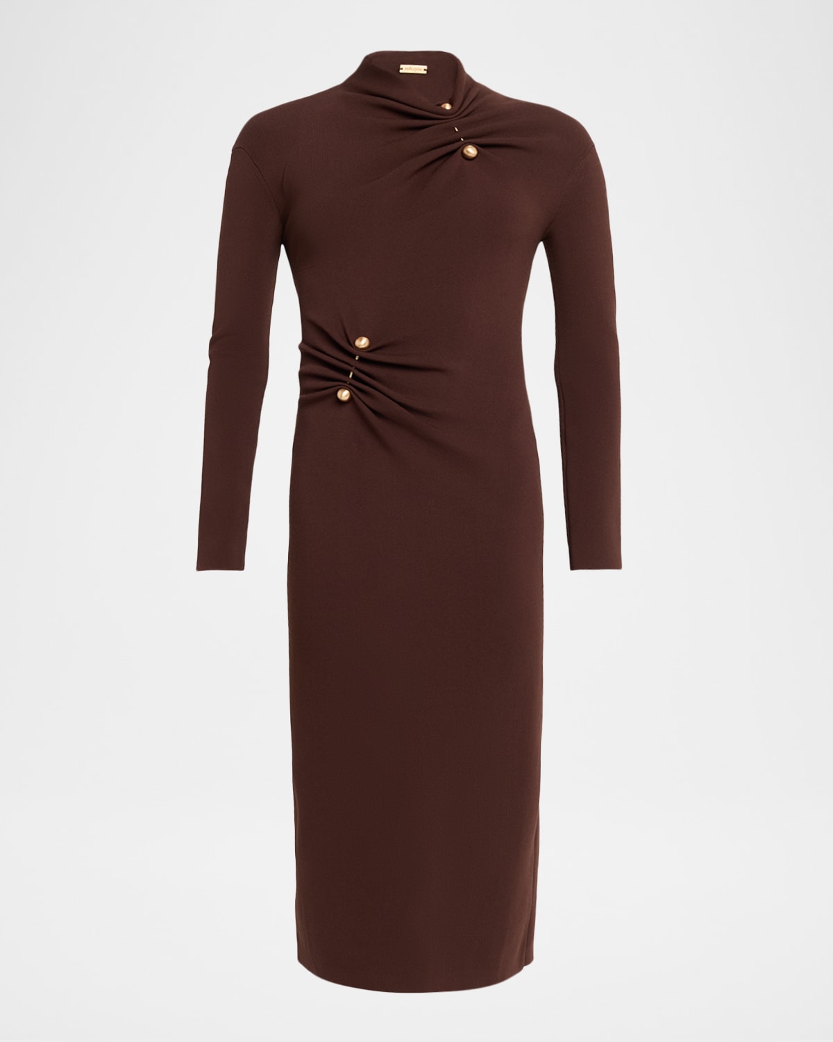 Cult Gaia's "Vera" midi dress skims the body in a stretch jersey knit, accentuated by goldtone pins that gather the fabric. Approx. 46"L from shoulder to hem Mock neckline Long sleeves Hem falls below the knee Sheath silhouette Slipover style Viscose/nylon Dry clean Imported