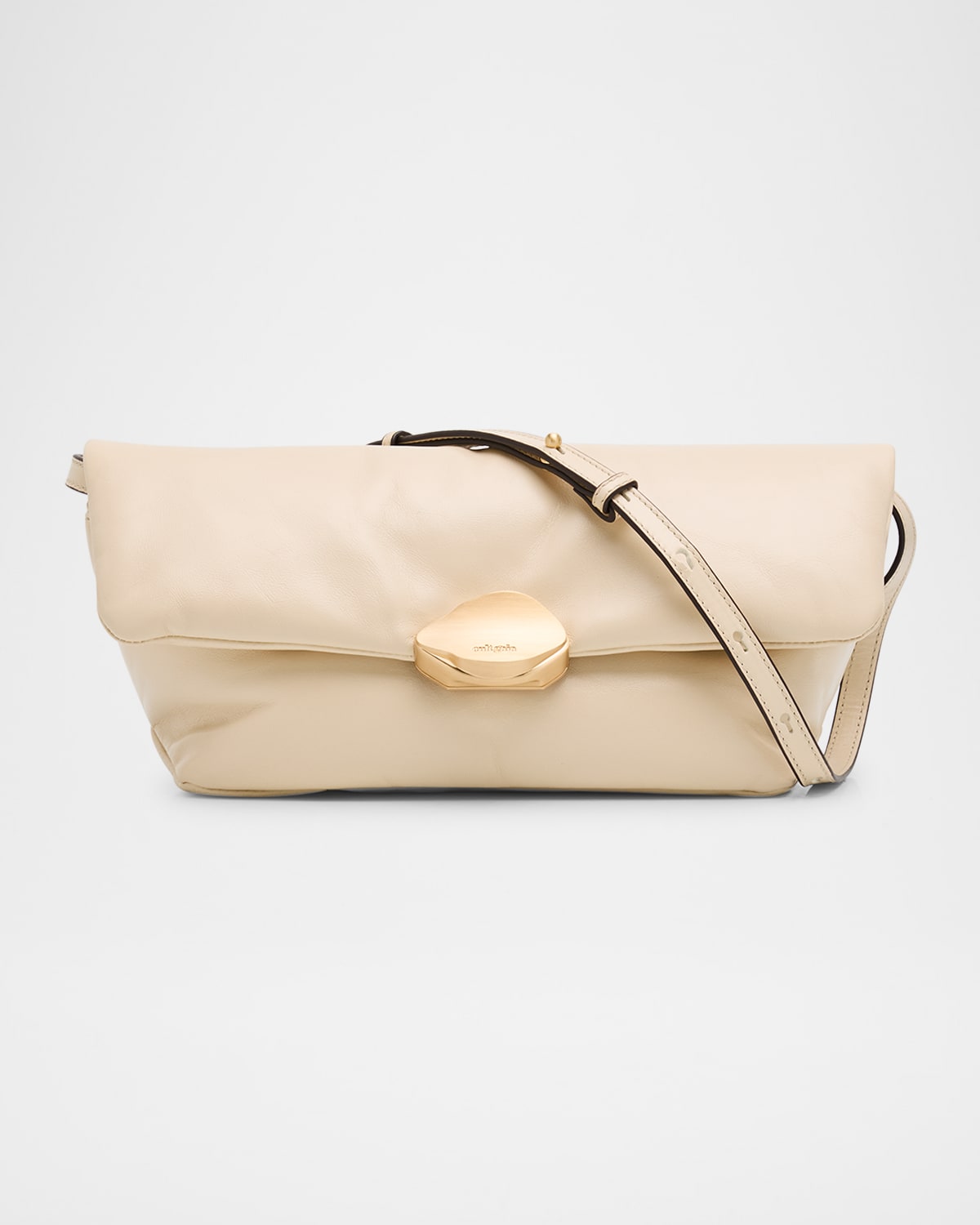 This puffy and angular Cult Gaia "Wren" shoulder bag is crafted in leather with a signature logoengraved Erin Earring accent Detachable, stowable shoulder strap Can be worn as a clutch or shoulder bag Flap top with magnetic clasp Interior, one card slot Lining: Cotton Approx. 5.5"H x 11.4"W x 5.1"D Spot clean Imported
