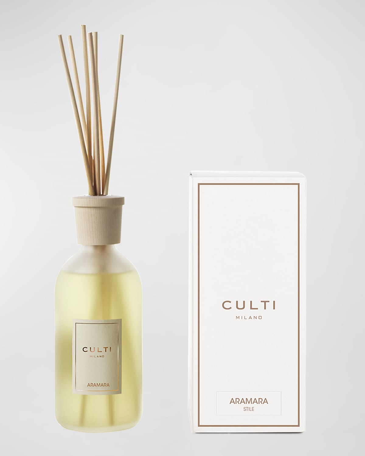 The cylindrical glass bottle with ivorycolored labels and a natural maple wood cap distinguish the pure and elegant aesthetic of the CULTI STILE line. The Mediterranea scent encapsulates the Apulian countryside in all of its fertile abundance, with pomegranate trees and prickly pears laden with fruits peeking above the drystone walls. Envision wandering into the Mediterranean scrub overlooking the sea, picking fruit, getting your hands dirty, and tasting its woody essence. 16.91 oz. / 500