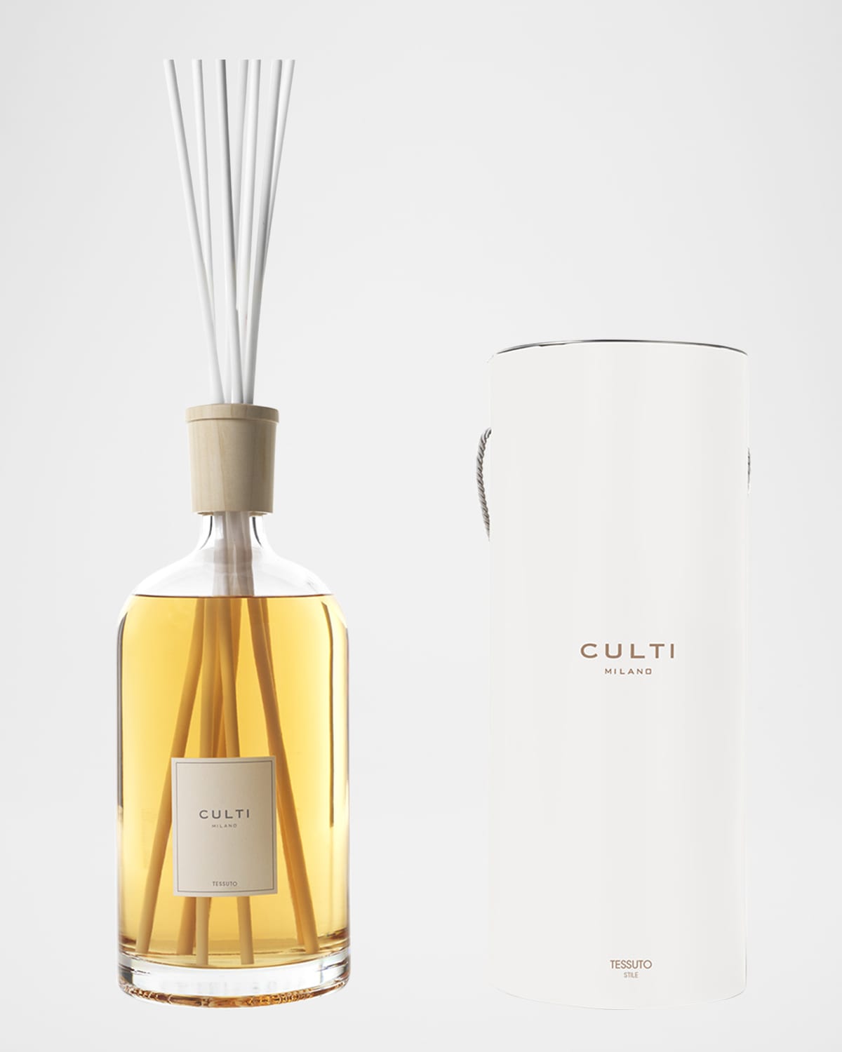 CULTI MILANO Tessuto Stile Classic Diffusor, 2500 mL What it is: The cylindrical glass bottle with ivorycolored labels and a natural maple wood cap distinguish the pure and elegant aesthetic of the Culti stile line. Tessuto is like walking through a cotton field, hands open, caressing the fluffy bolls. Envision touching the cool, reassuring texture and lightness of fine silk weaves and natural linens on Lake Como. A sense of feeling at home, always. Fragrance profile: Floral/fruity 85 oz. / 2500