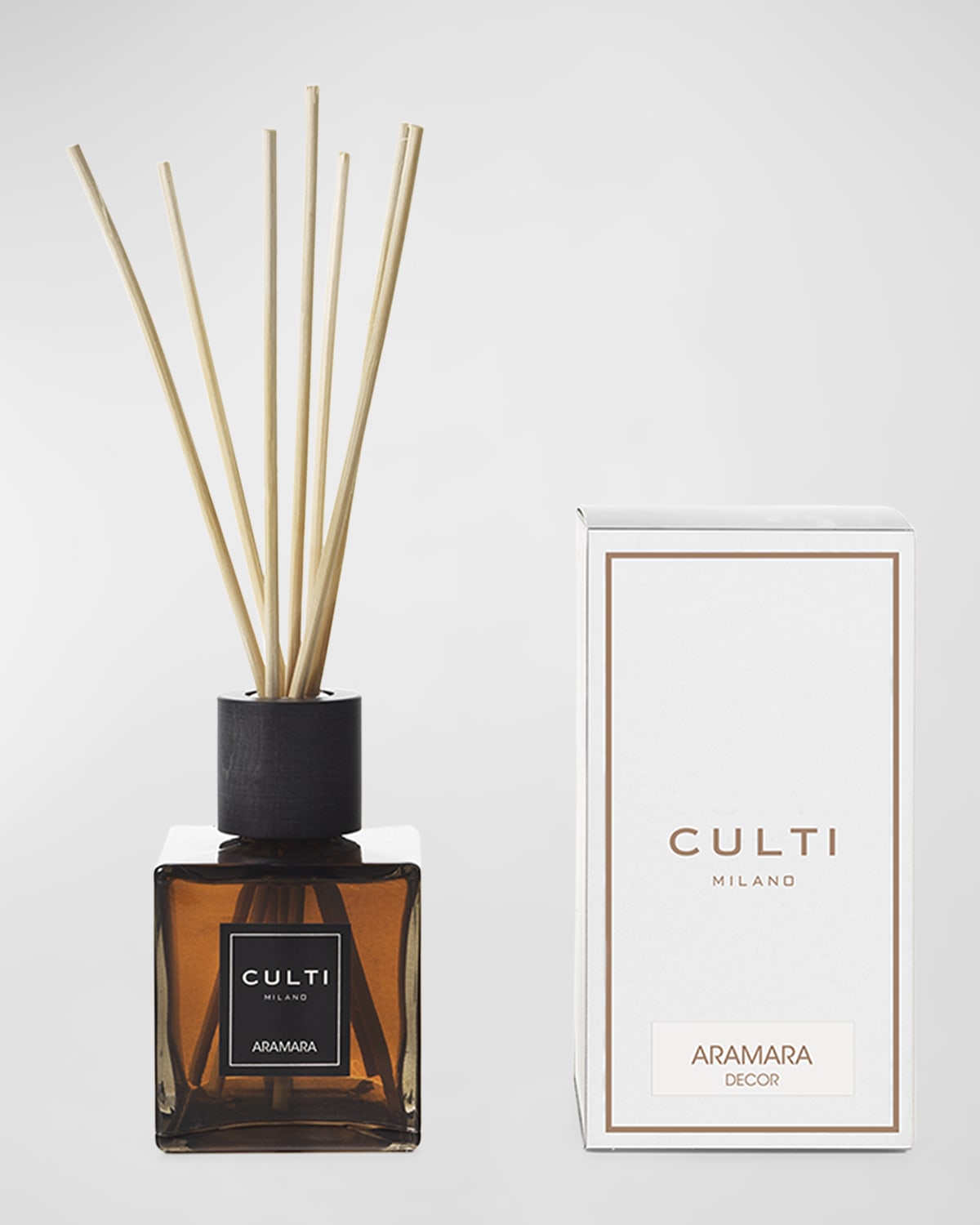 The sculpted, squareshaped bottle in thick glass with dark brown maple wood cap are the bold, distinct features of the CULTI DECOR line, which add a touch of character to any room. Thé evokes relaxation and serenity just like soaking in the meditative warmth of a bath tub filled with Japanese green tea. Envision the vapours rising hypnotically off the water, delicately diffusing and filling the room with the aroma of tea leaves. 8.45 oz. / 250