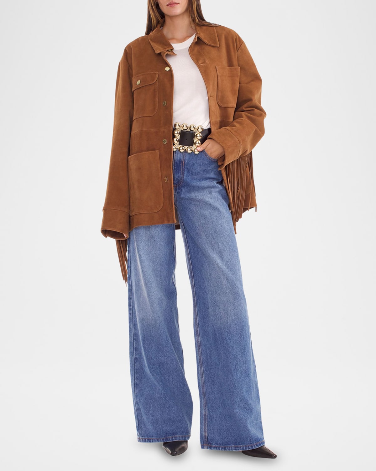 Cynthia Rowley jacket in faux suede with fringe trim Approx. 29.5"L from shoulders to hem Spread collar; button front Long sleeves; button cuffs Buttoned chest pocket Front patch pockets Oversized fit Polyester Lining: Polyester Leather method dry cleaning Trim: Faux suede Imported