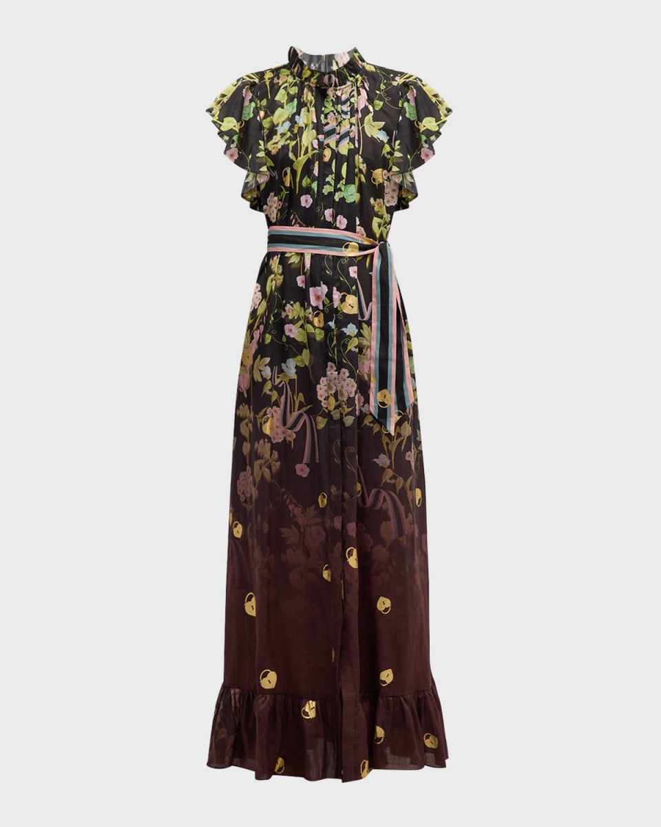 Cynthia Rowley kaftan in an ombré floral print High neckline; concealed button front Short flutter sleeves Waist selftie Flounce ruffle hem Full length Aline silhouette Ramie Unlined Dry clean Imported