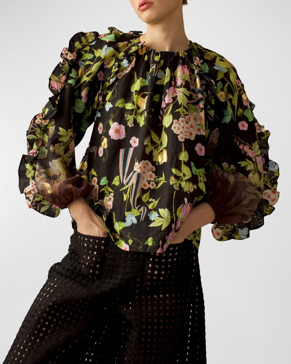 Cynthia Rowley ruched blouse in a floral print with ruffle trim Approx. 22"L from shoulders to hem Elasticized crew neckline 3/4 raglan blouson sleeves Elasticized cuffs Boxy fit Pullover style Ramie Dry clean Imported