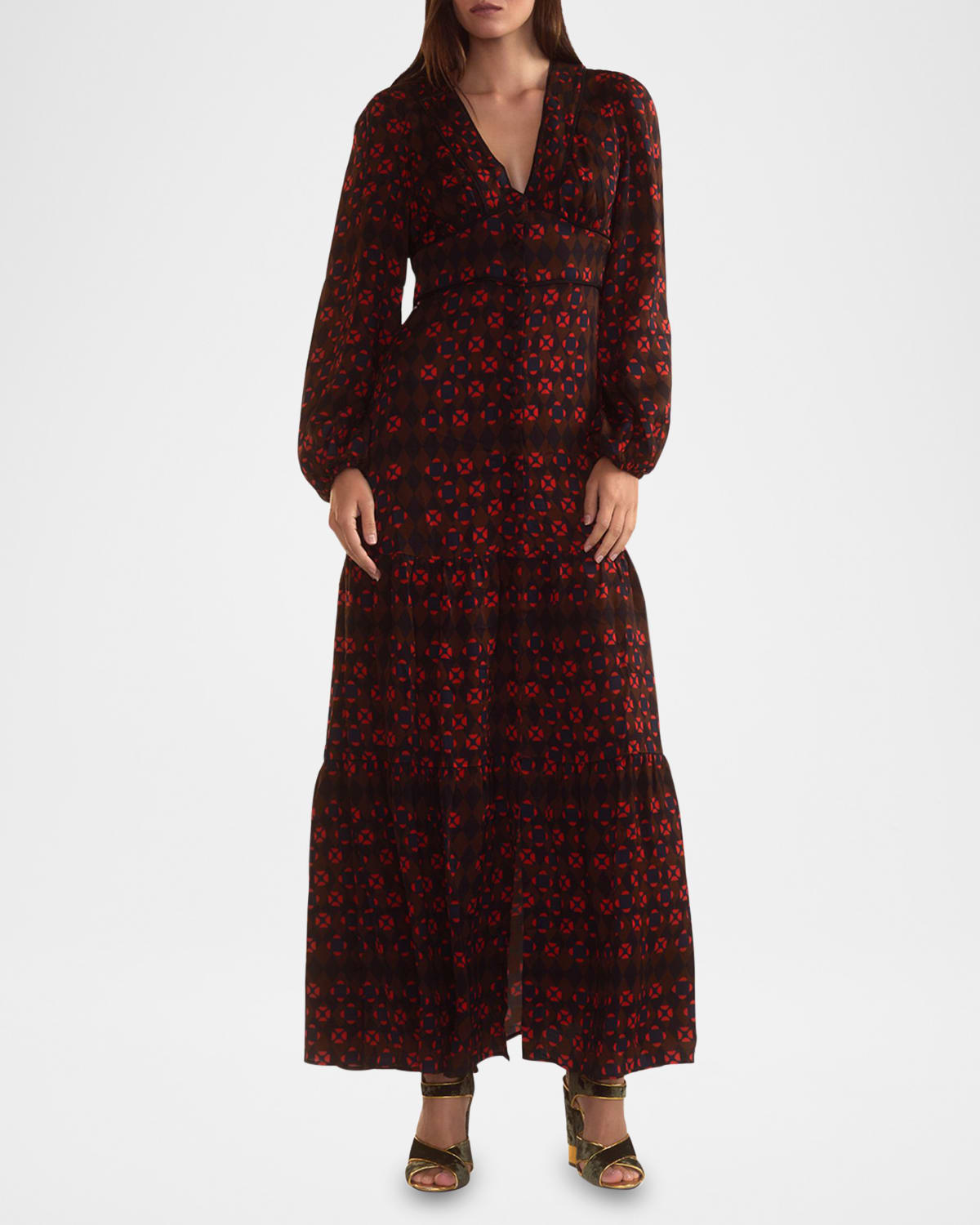 Cynthia Rowley tiered maxi dress in a geometric print Approx. 57"L from shoulders to hem V neckline; button front Long sleeves; elasticized cuffs Empire waist Full length Aline silhouette Viscose/Proviscose® rayon Lining: Polyester Dry clean Imported