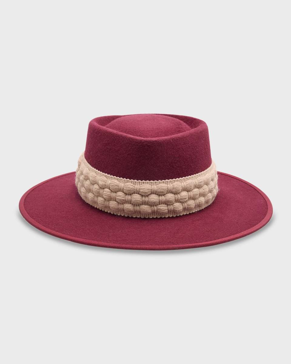 D'Estree "Gerhard" fedora in wool and cotton Geometric crown Knit band at break Wide, flat brim Gently brush the felt Made in France