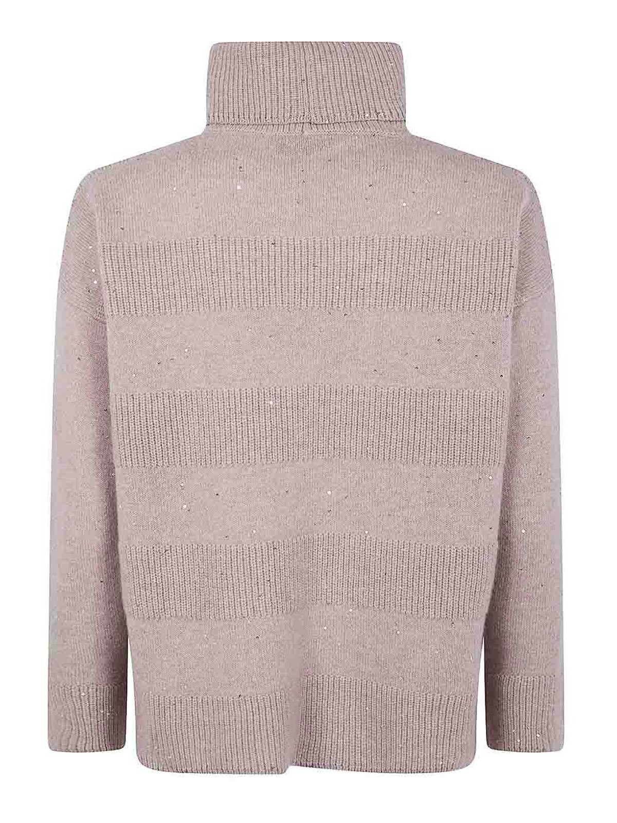 Col roulé en tricot côtelé beige clair, ornements en sequins, rayures horizontales, manches longues