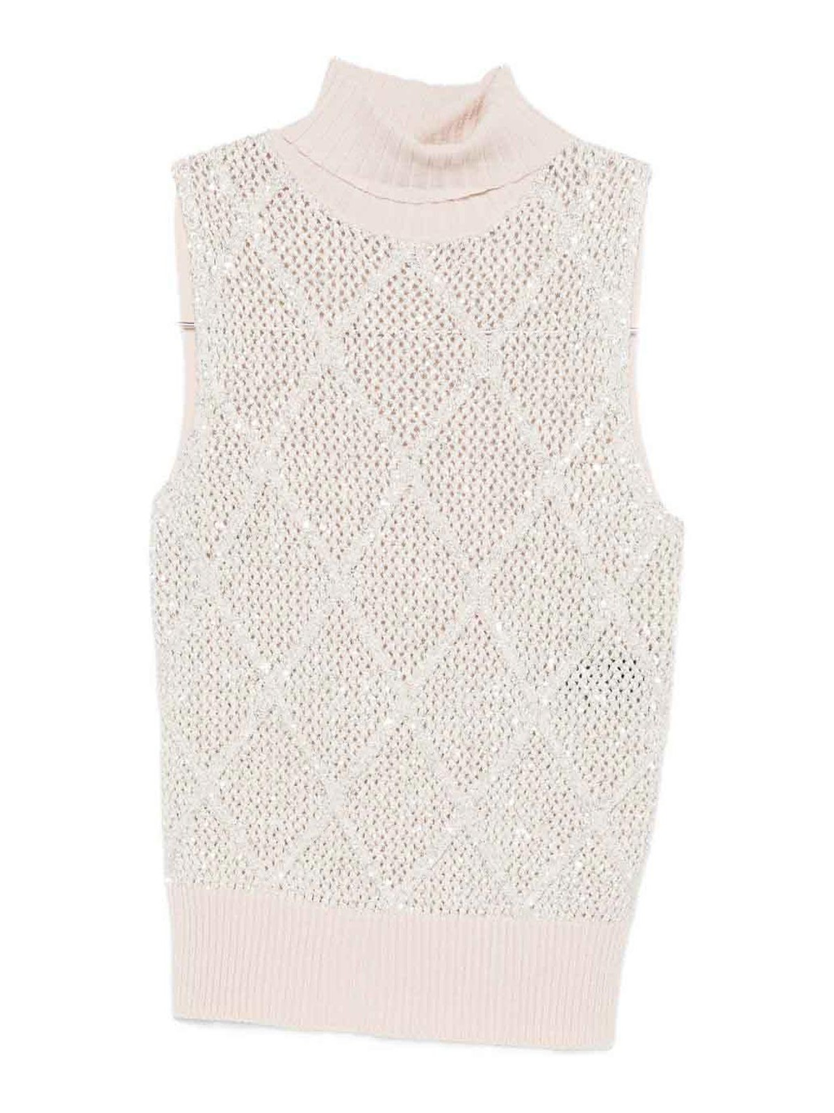Col roulé et ourlet côtelé sans manches, col roulé, blanc cassé, orné de paillettes