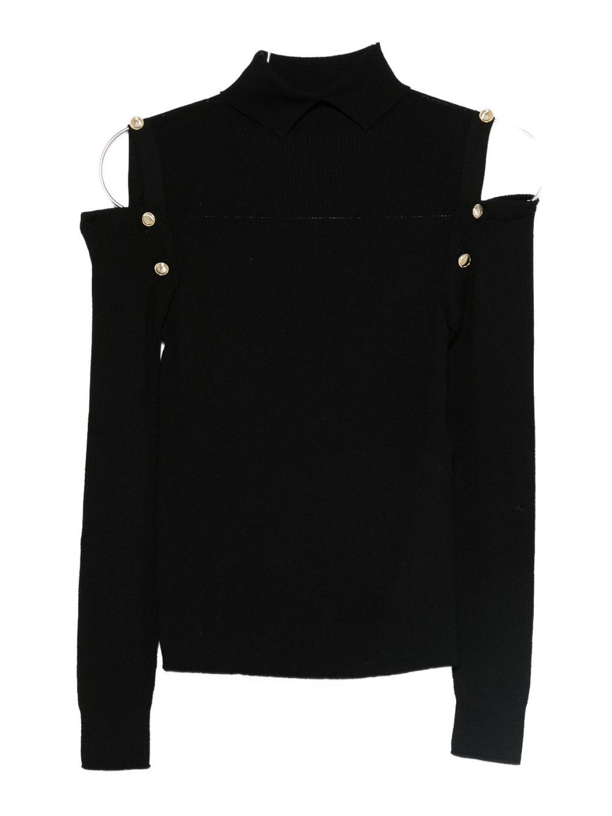 Col montant en tricot côtelé noir orné de boutons et épaules dénudées et manches longues