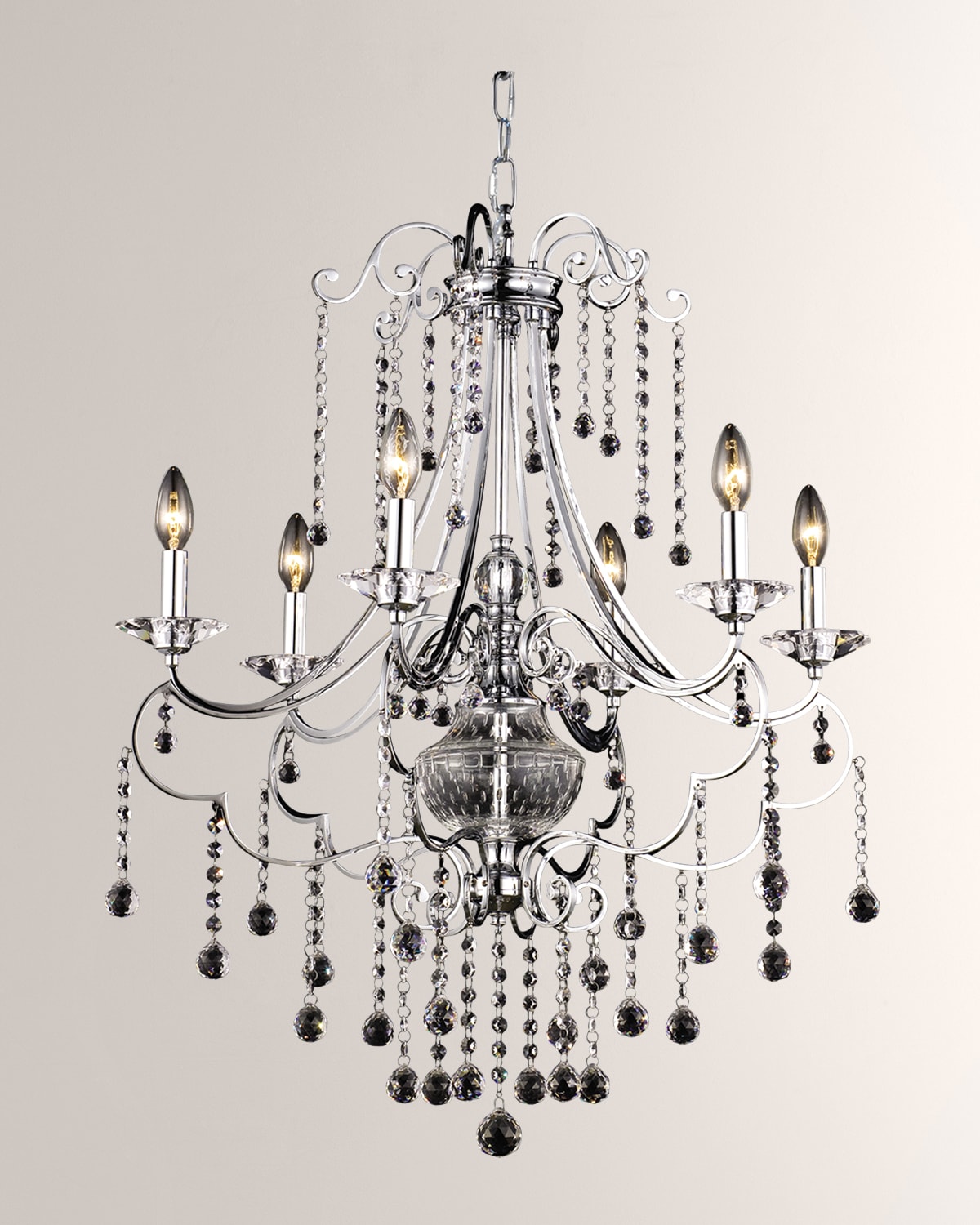 Chandelier features a metal base that is finished in gleaming polished chrome. Finely faceted crystal bowl at center with intricate scrolls surrounding the bottom. Each scroll is draped with a series of more beaded chain with large prisms at the end. Uses nine E12 60watt bulbs (not included). Bulbs are covered with removable bulb covers. 27"Dia. x 32"T with 6'L chain and 10'L wire. Assembly required. UL approved. For indoor use. Wipe clean. 1 year electrical warranty. Imported. Boxed weight, approximately 24.5 lbs.