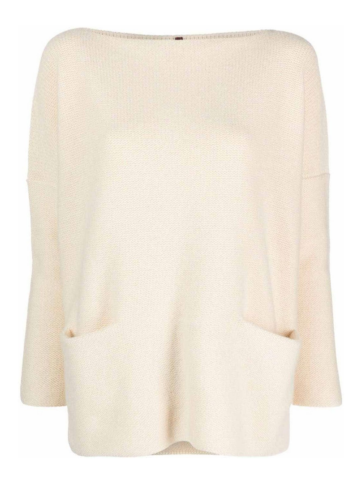 Construction en tricot beige clair, col bateau, épaules, manches longues, deux poches à jets, ourlet droit