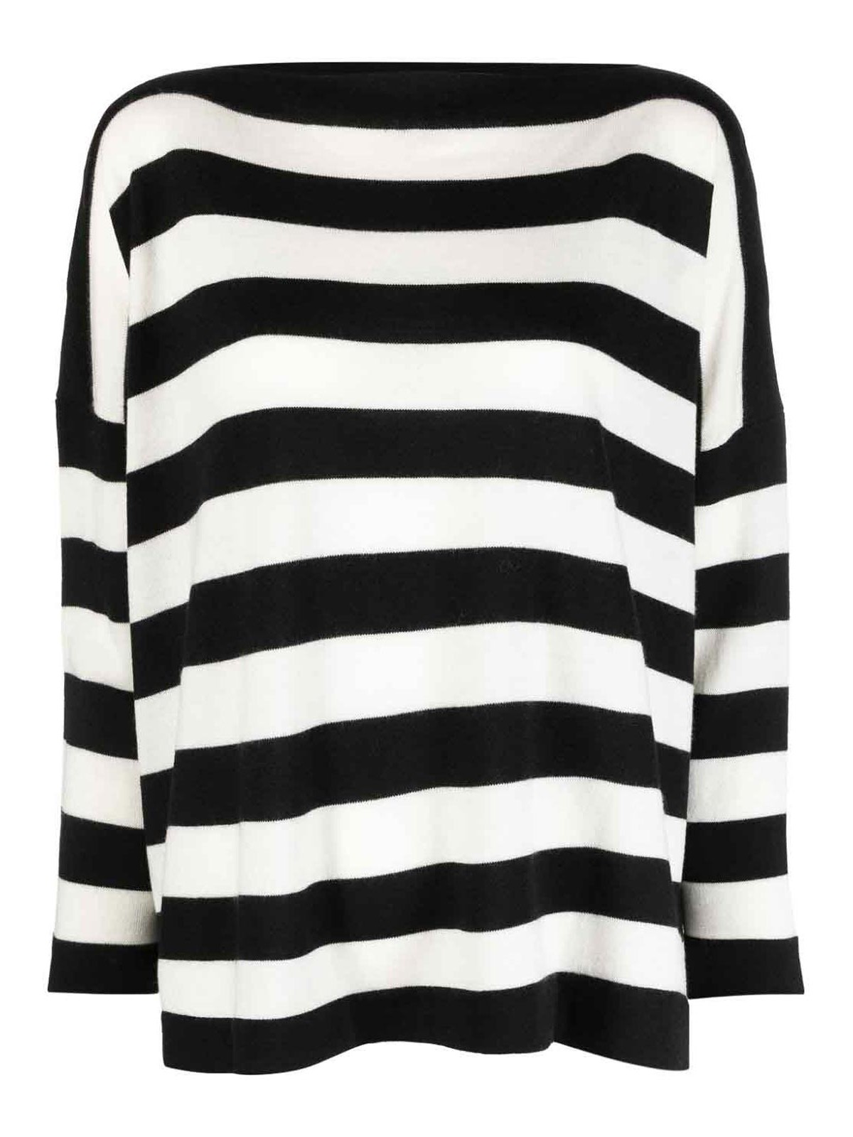 Tricot côtelé blanc/noir à rayures horizontales, col bateau, épaules, manches 3/4, fentes latérales, ourlet droit, nom de la couleur du créateur: noir