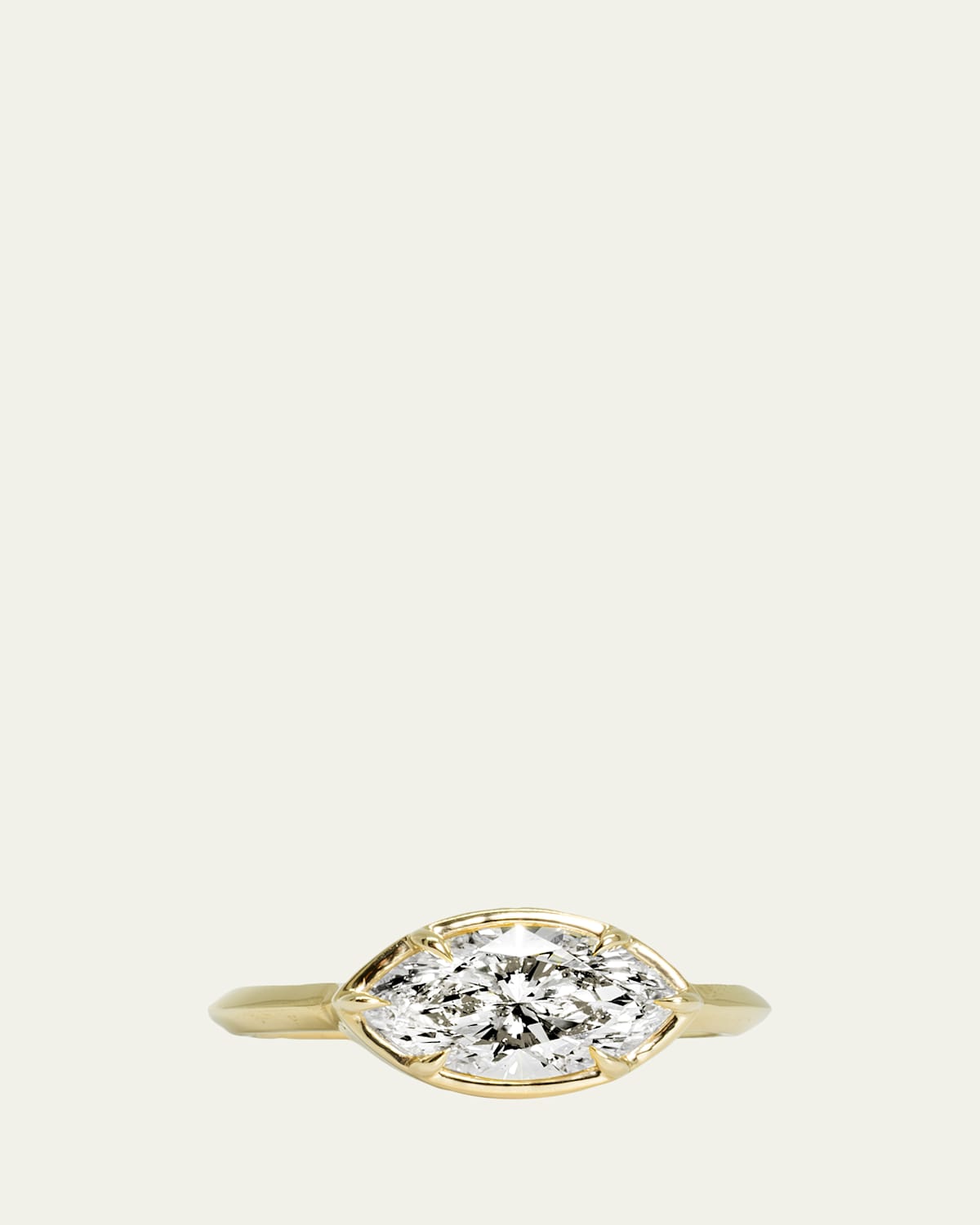 Dara Kaye showcases a beautiful labgrown diamond cut into a brilliant marquise shape for this solitaire ring. Shiny 14karat yellow gold Labgrown diamond (DEF color) Diamond total carat weight: 1.03 Made in USA