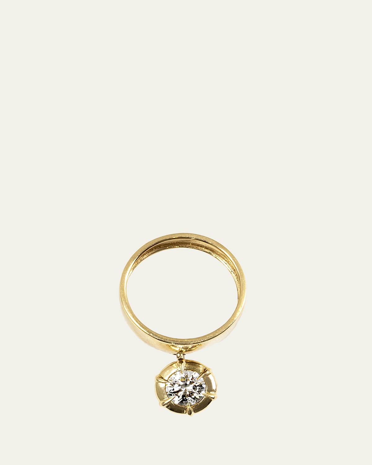 Dara Kaye showcases a beautiful labgrown diamond cut into a brilliant round shape for this diamonddangle ring. Approx. 8mm width band Shiny 14karat yellow gold Labgrown diamond (DEF color) Diamond total carat weight: 0.65 Made in USA