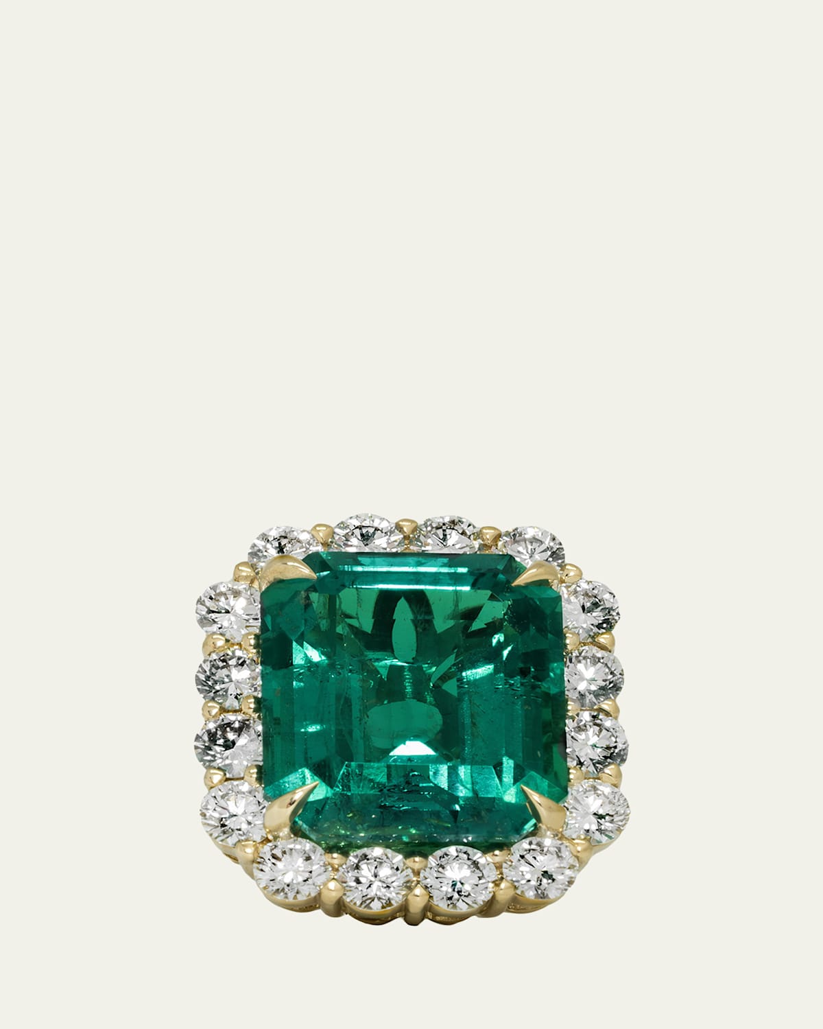A glowing green labgrown emerald is showcased on this Dara Kaye cocktail ring. Additionally, the emerald is surrounded by a halo of labcreated diamonds to match the statement piece. Shiny 14karat yellow gold Labgrown diamonds (DEF color) Diamond total carat weight: 2.00 One labgrown Colombian emerald Emerald total carat weight: 14.00 Made in USA