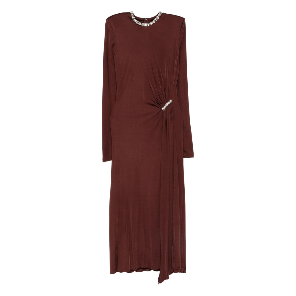 burgundy crystal embellishment draped detail long sleeves round neck asymmetric hem