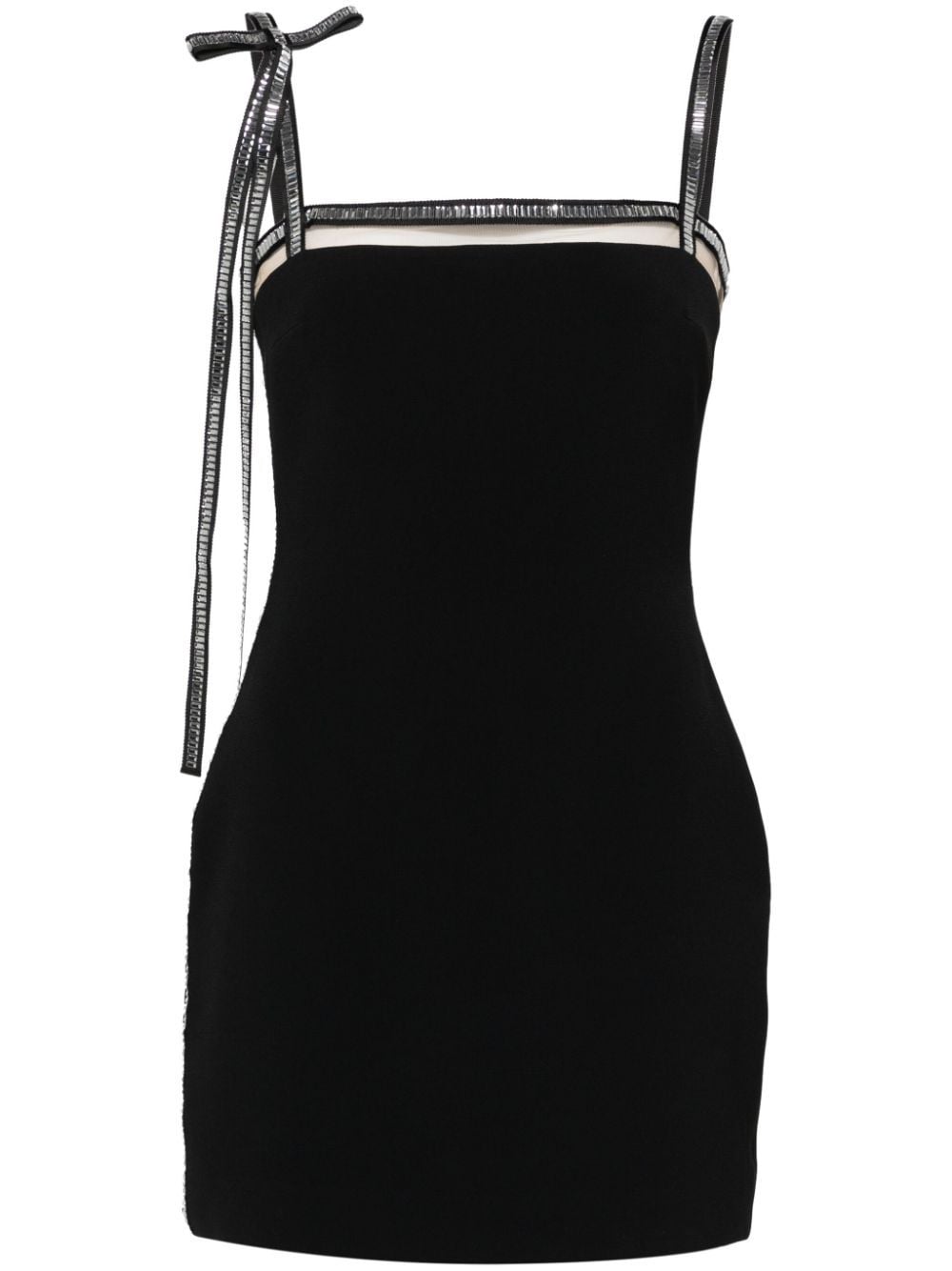 black crepe texture crystal embellishment sheer panel to the chest thin straps with bow detailing sleeveless square neck thigh-length straight hem full lining concealed rear hook and zip fastening