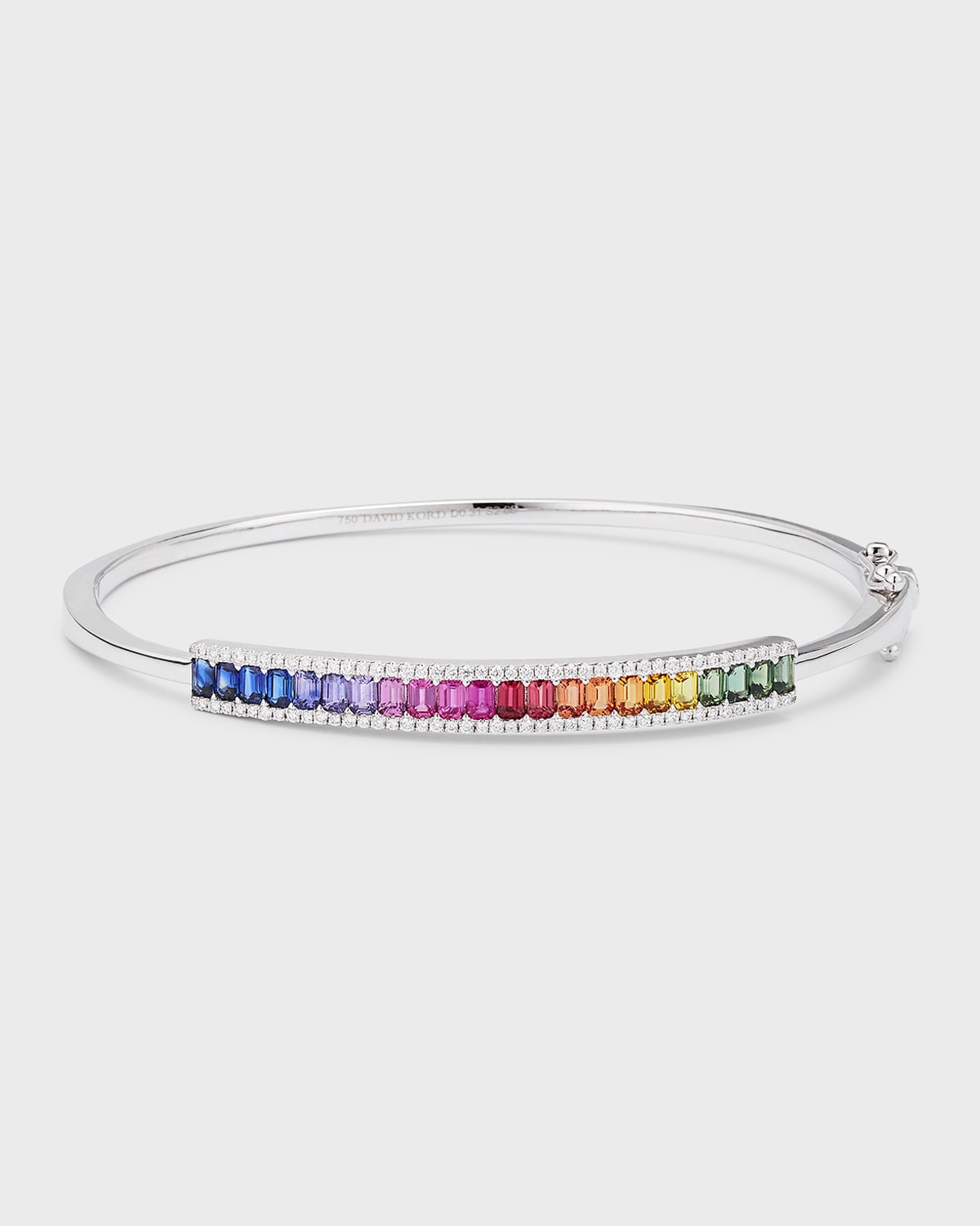David Kord bangle bracelet Solid 18karat white gold with a polished finish Multihued rainbow sapphires in shared prong settings Edges are decorated with white diamonds 2.09 total sapphire carat weight 0.31 total diamond carat weight Hinged opening eases dress Imported