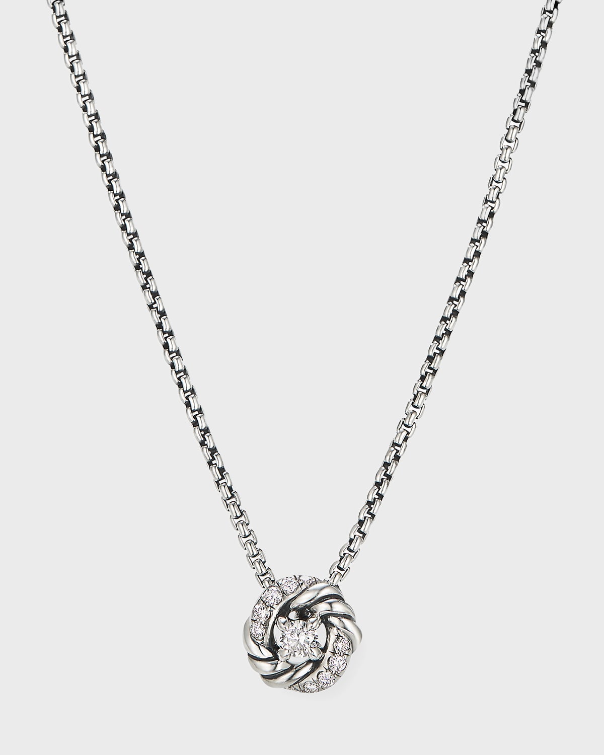 David Yurman pendant necklace. Sterling silver chain and hardware. 8mm pendant with white diamonds. 0.12 total diamond carat weight. Adjustable; lobster clasp. Approx. 1618"L. Imported.
