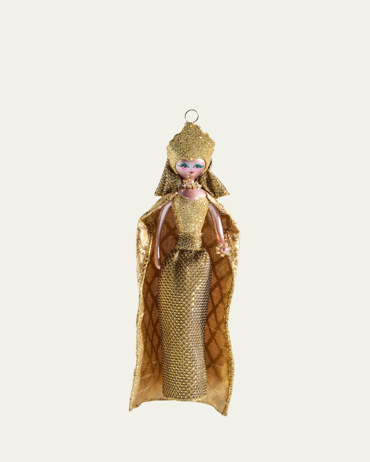 Fashionista ornament dressed in a Cleopatrainspired ensemble Handcrafted of glass, polyester ribbon, noncorrugated paper and plastic Approx. 3.5"L x 1.6"W x 7.1"T Made in Italy